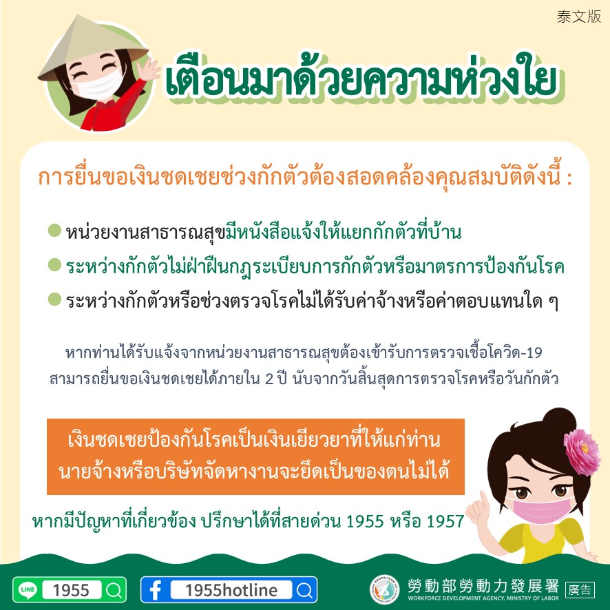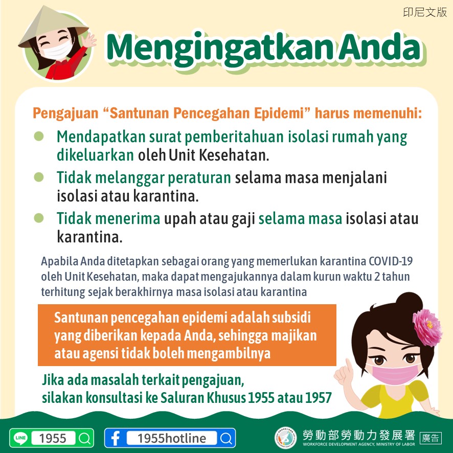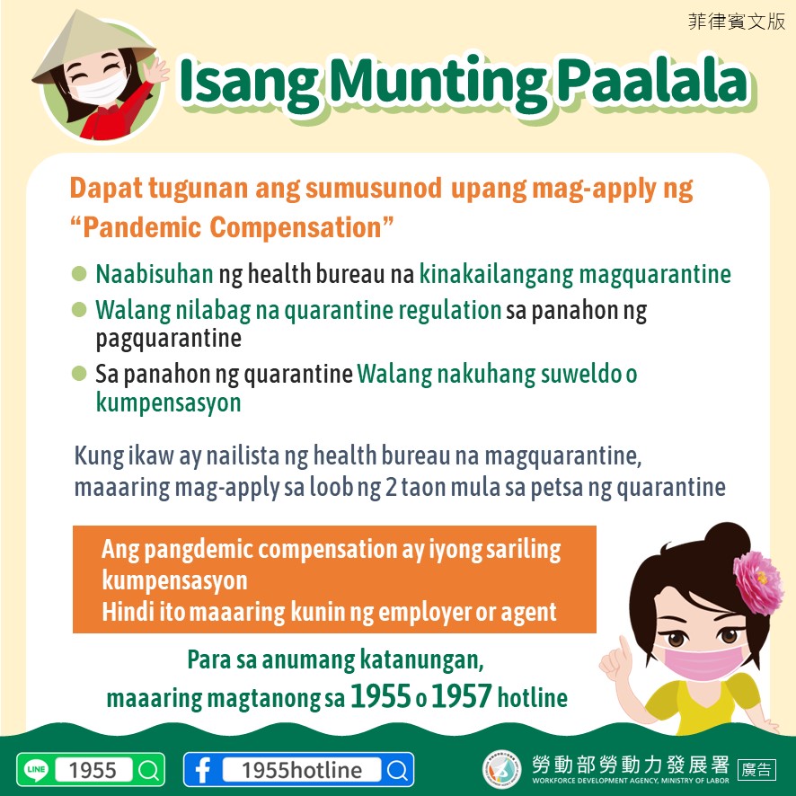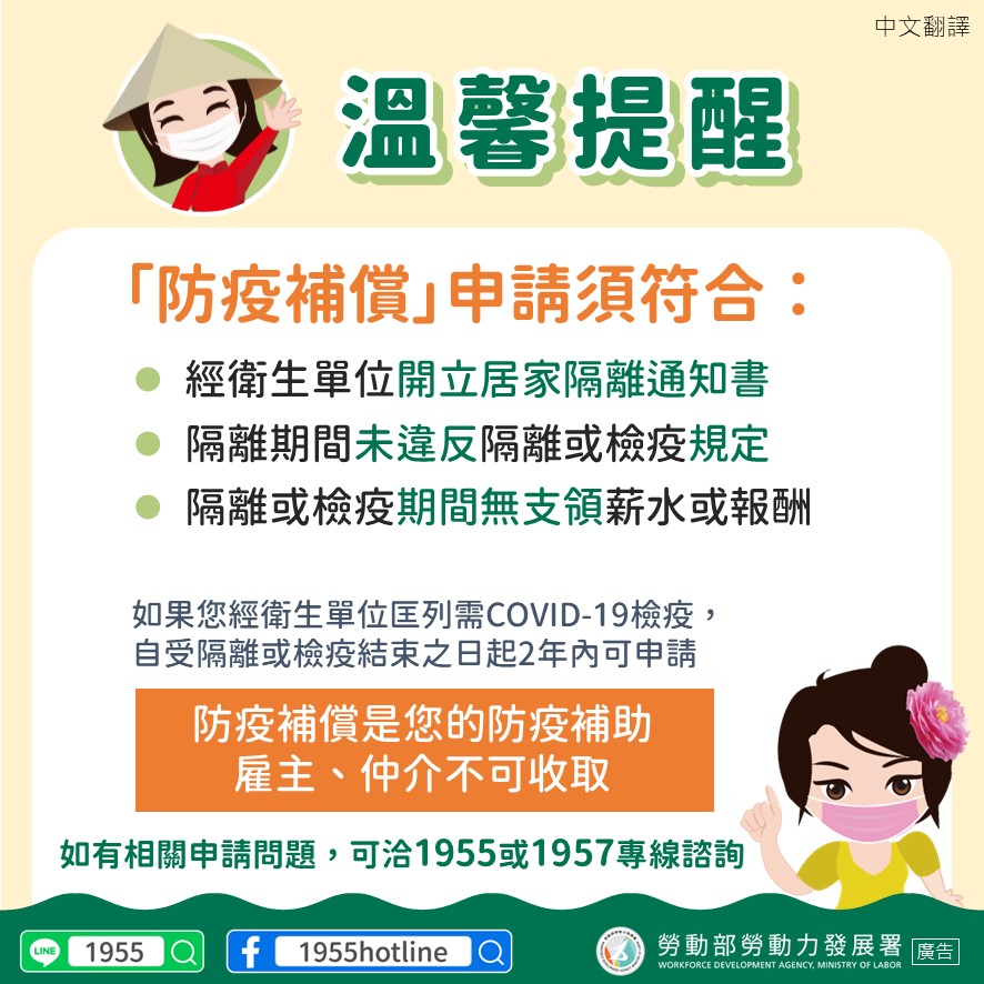 「防疫補償」申請須符合:1. 經衛生單位開立居家隔離通知書2. 隔離期間未違反隔離或檢疫規定3. 隔離或檢疫期間無支領薪水或報酬如果您經衛生單位匡列需COVID-19檢疫,自受隔離或檢疫結束之日起2年內可申請防疫補償是您的防疫補助,雇主、仲介不可收取如有相關申請問題,可洽1955或1957專線諮詢