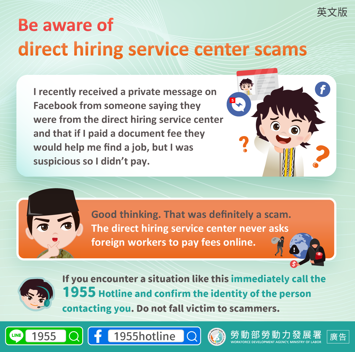 最近在 Facebook 收到有人私訊我說他是直聘中心的人,要我繳交證件費用幫我安排工作,因為覺得很可疑,所以我沒有照做。