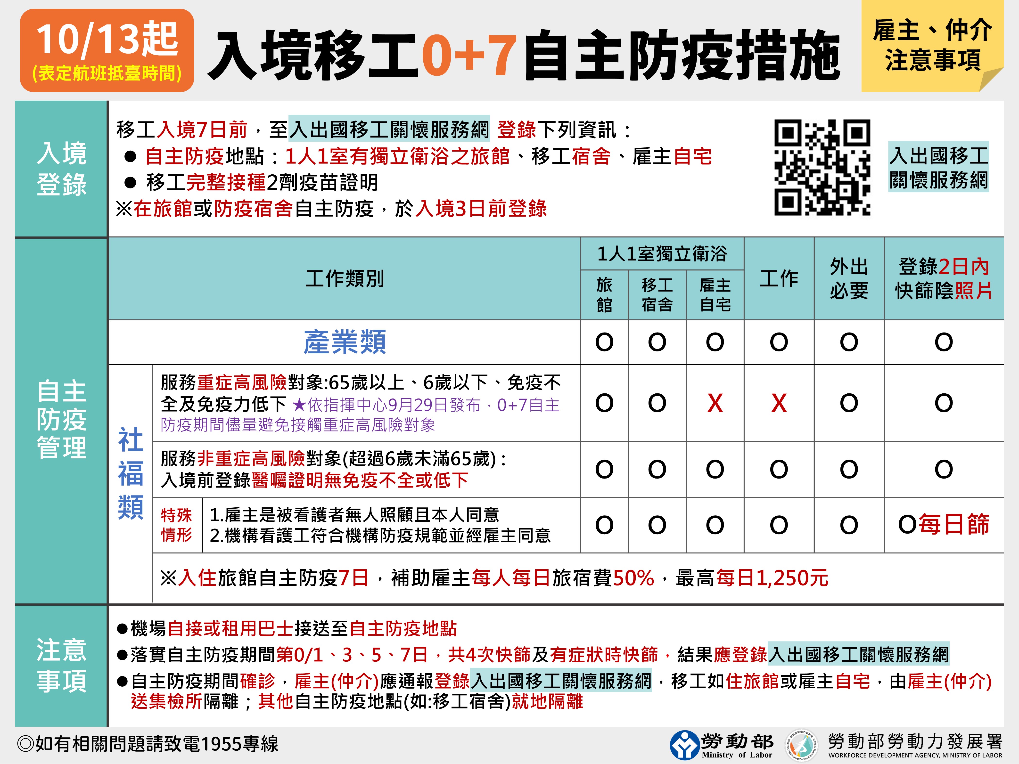 配合指揮中心0+7邊境檢疫措施,勞動部報請指揮中心同意,自111年10月13日起,雇主應安排移工於符合1人1室且有獨立衛浴之旅館、移工宿舍或雇主自宅之地點自主防疫;產業移工及非重症高風險社福移工依規定快篩陰性,得於7日自主防疫期間內從事許可之工作。