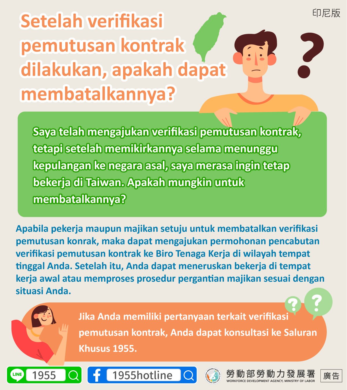 Saya telah mengajukan verifikasi pemutusan kontrak, tetapi setelah memikirkannya selama menunggu kepulangan ke negara asal, saya merasa ingin tetap bekerja di Taiwan. Apakah mungkin untuk membatalkannya?