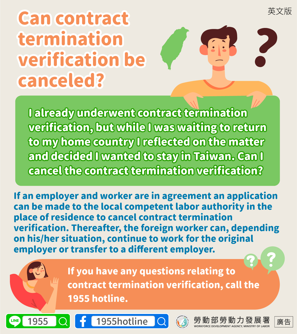 I already underwent contract termination verification, but while I was waiting to return to my home country I reflected on the matter and decided I wanted to stay in Taiwan. Can I cancel the contract termination verification?