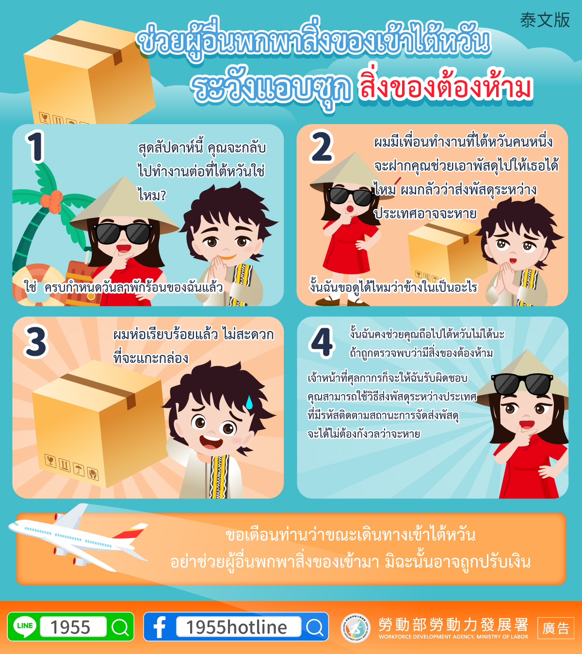 ขอเตือนท่านว่าขณะเดินทางเข้าไต้หวันอย่าช่วยผู้อื่นพกพาสิ่งของเข้ามา มิฉะนั้นอาจถูกปรับเงิน