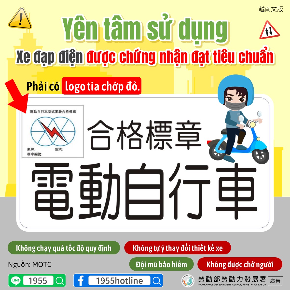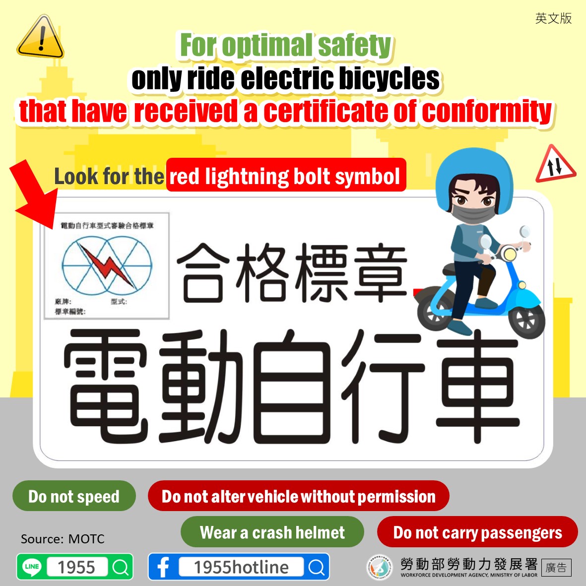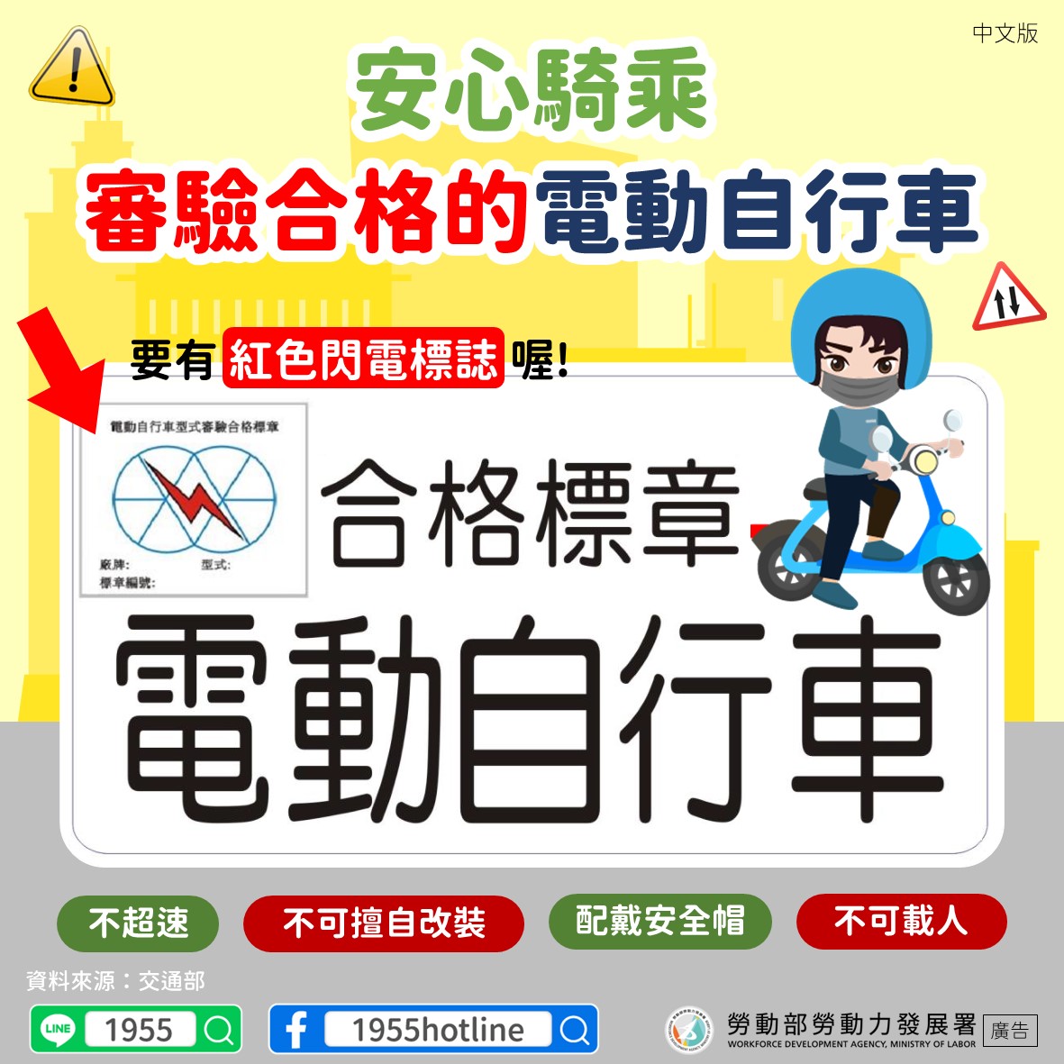 重要通知 請雇主或仲介公司向移工宣導請騎乘或購買有紅色閃電標誌的合格標章的電動自行車。