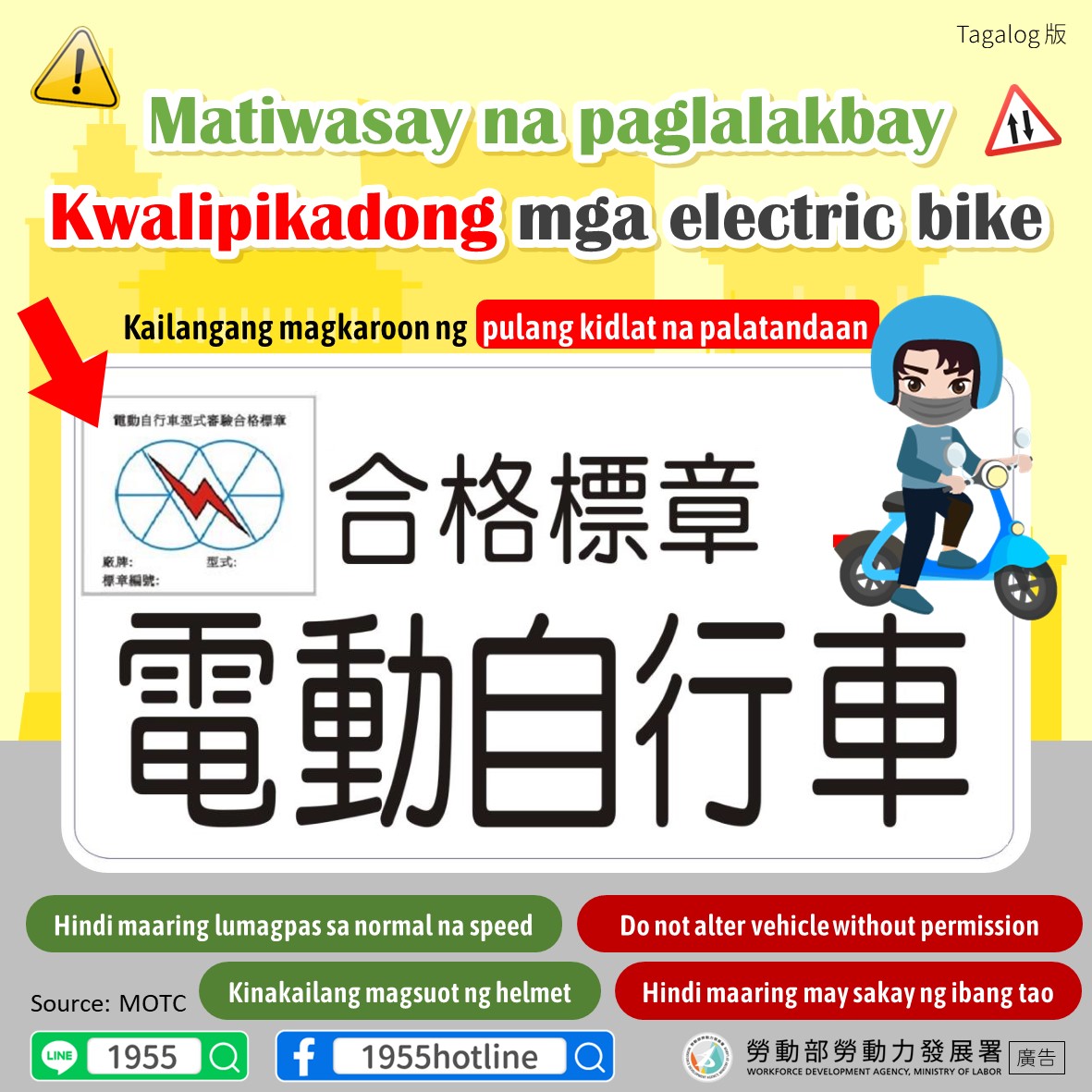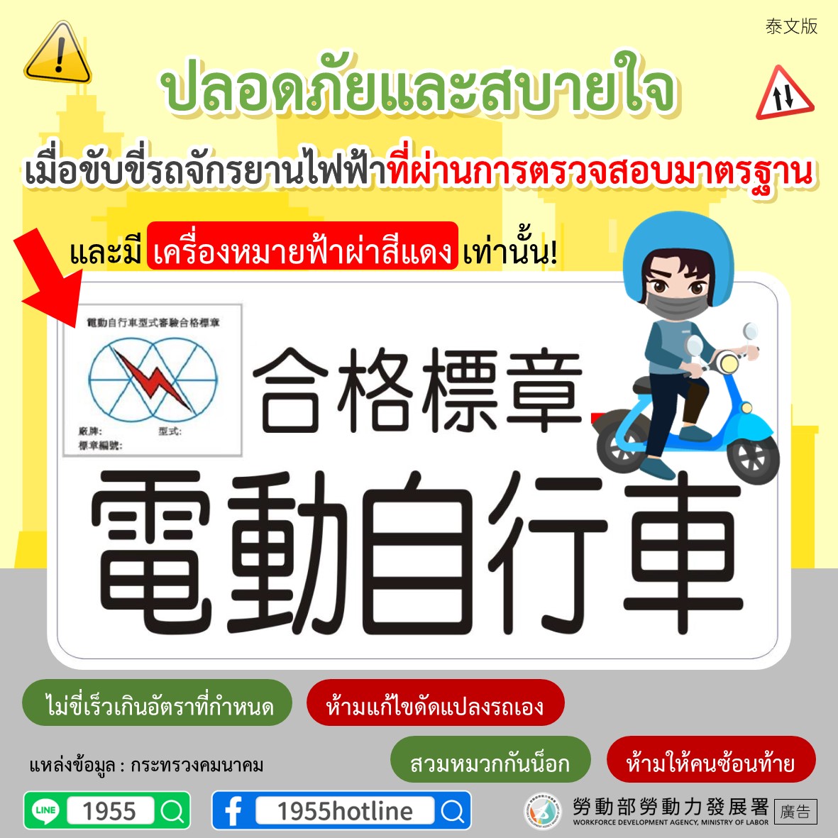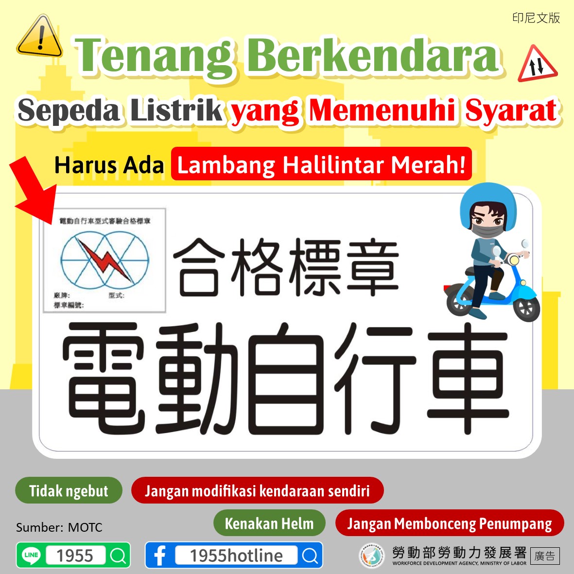 重要通知 請雇主或仲介公司向移工宣導請騎乘或購買有紅色閃電標誌的合格標章的電動自行車。