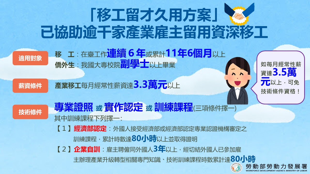 自去(111)年4月30日起實施「移工留才久用方案」,勞動部積極鼓勵國內雇主可將現有所聘僱符合資格的優秀資深移工申請轉任或於聘期屆滿後聘僱為中階技術人力,對於雇主及轉任的移工有相當多的好處及優點。另為進一步鼓勵雇主申請聘僱中階技術人力,近期也增列由雇主自行安排所聘僱移工接受公司相關專門技術課程並達規定時數者,亦符合技術條件的資格。