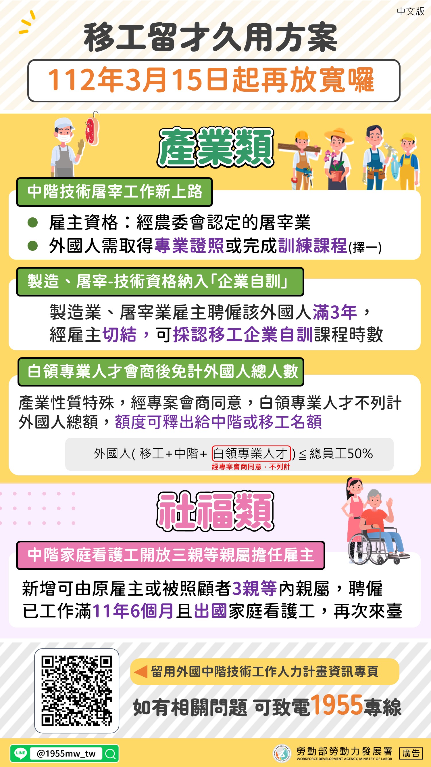 勞動部鼓勵雇主可評估將目前所聘僱符合資格的優秀資深移工轉任為中階技術人力,進而提升我國整體產業及經濟發展的競爭力,或協助分攤家庭照顧工作減輕照顧負擔。雇主或民眾想瞭解更多申請資訊,可上「留用外國中階技術工作人力計畫資訊專頁」查詢相關規定與更多訊息,或洽電話服務中心(02)8995-6000,將由專人提供諮詢服務。