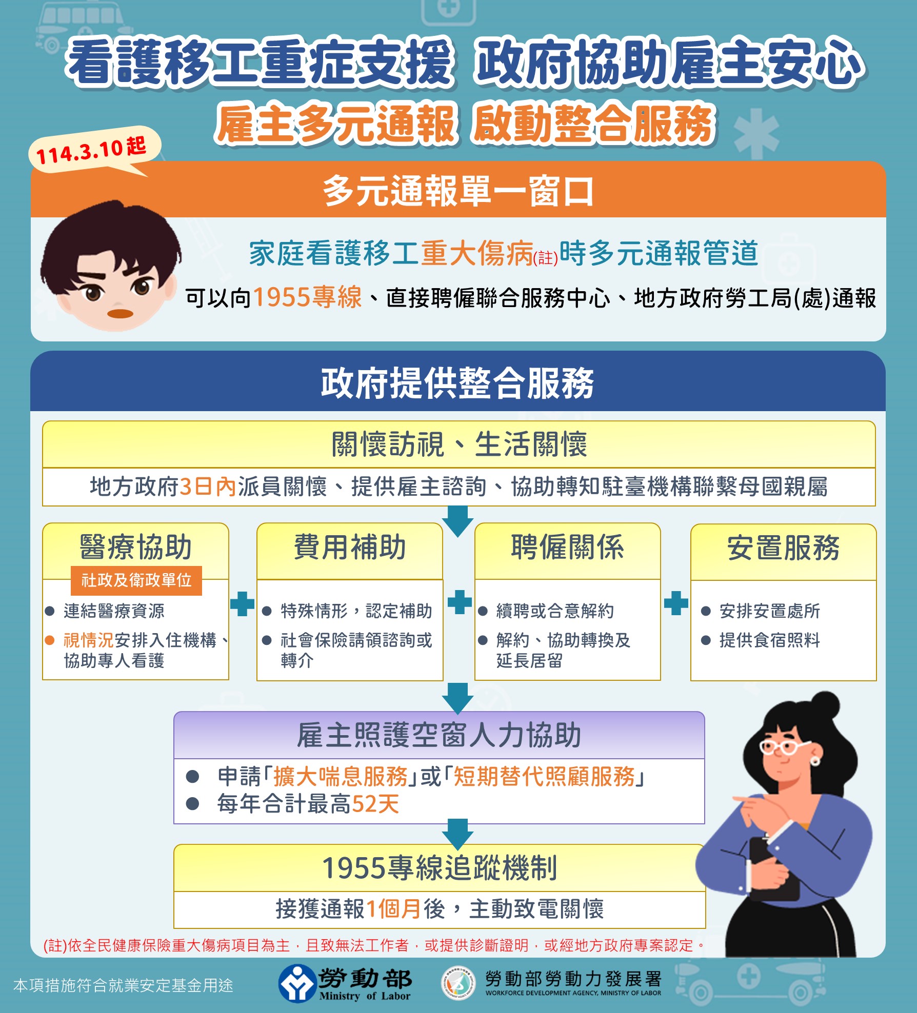 勞動部表示,家庭看護移工重大傷病整合服務的實施,可提供雇主整合性的協助,並確保家庭看護移工能在健康、工作、生活上獲得支持,藉此強化勞資雙方和諧,促進勞雇雙贏,如欲瞭解該機制之相關細節,亦可撥打1955免付費專線諮詢。