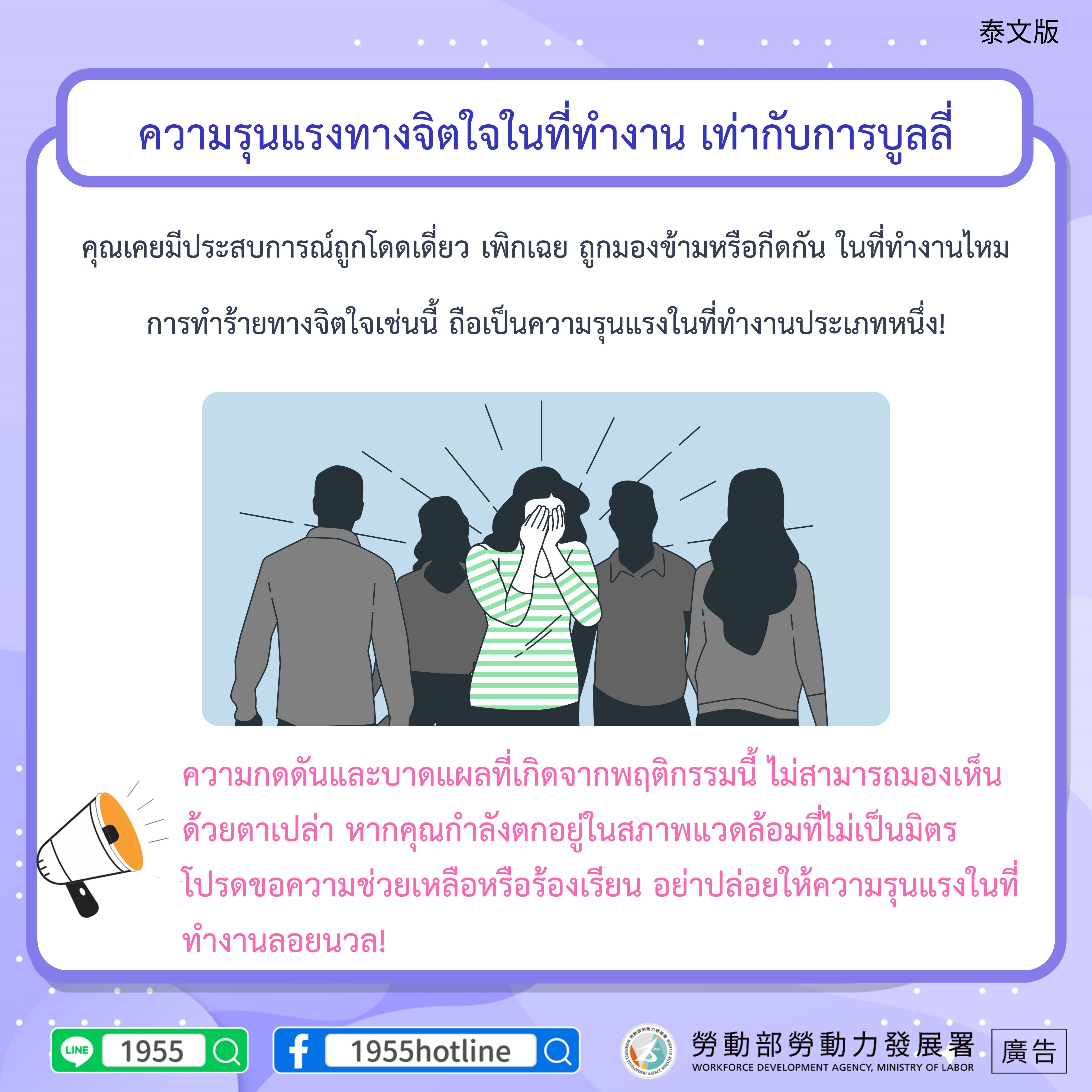 ความกดดันและบาดแผลที่เกิดจากพฤติกรรมนี้ ไม่สามารถมองเห็นด้วยตาเปล่า หากคุณกำลังตกอยู่ในสภาพแวดล้อมที่ไม่เป็นมิตร โปรดขอความช่วยเหลือหรือร้องเรียน อย่าปล่อยให้ความรุนแรงในที่ทำงานลอยนวล!