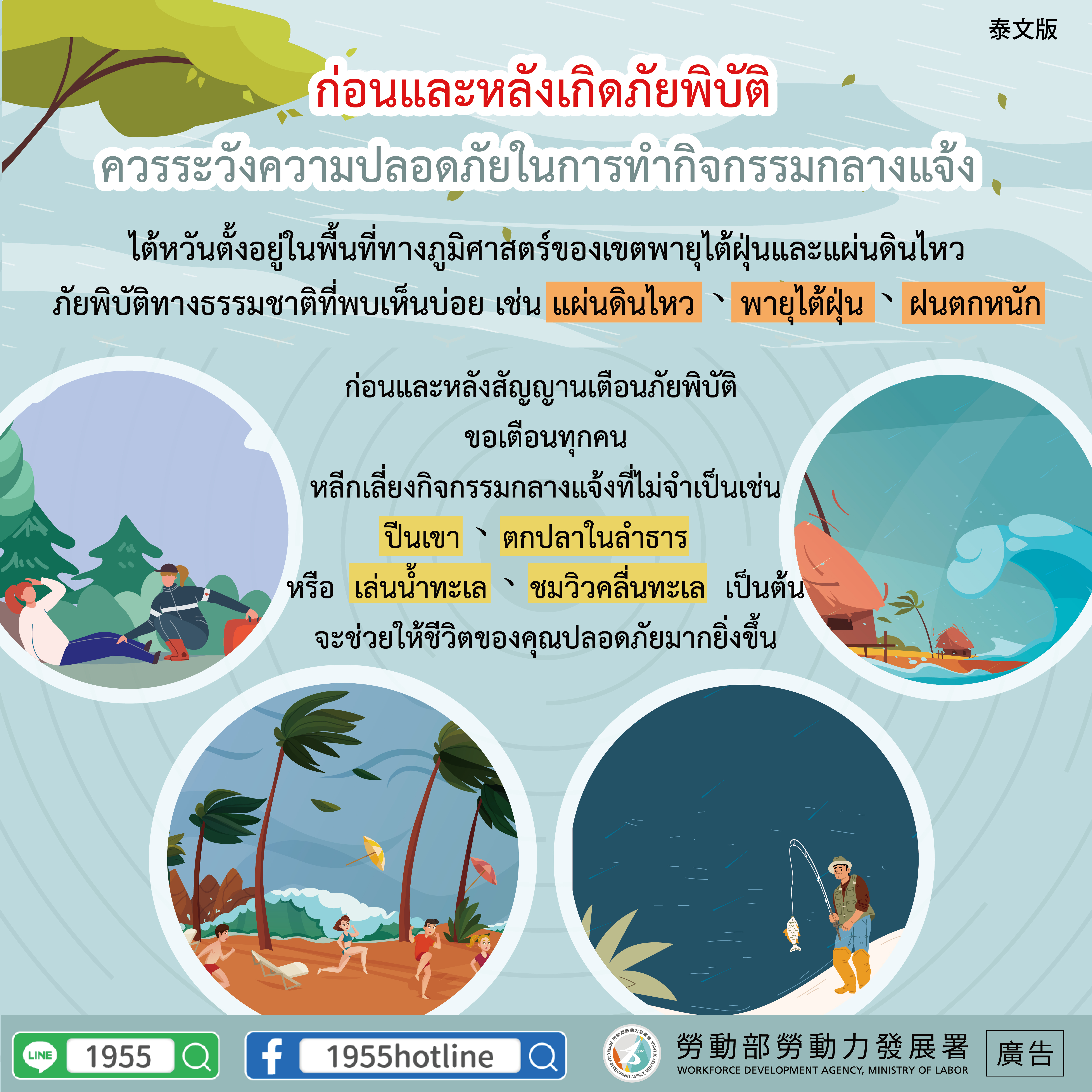 提醒您天災警報前後,應避免非必要的戶外活動,如登山、溪流垂釣或是海邊戲水、觀潮等,才能保障自身的生命安全喔