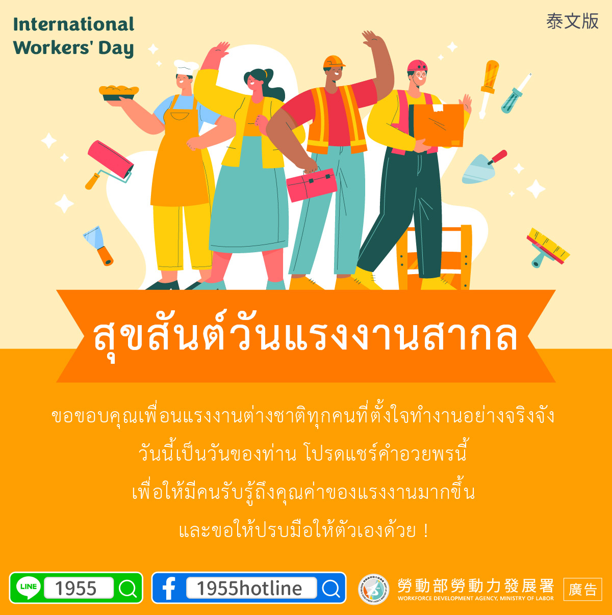 ขอขอบคุณเพื่อนแรงงานต่างชาติทุกคนที่ตั้งใจทำงานอย่างจริงจังวันนี้เป็นวันของท่าน โปรดแชร์คำอวยพรนี้เพื่อให้มีคนรับรู้ถึงคุณค่าของแรงงานมากขึ้น