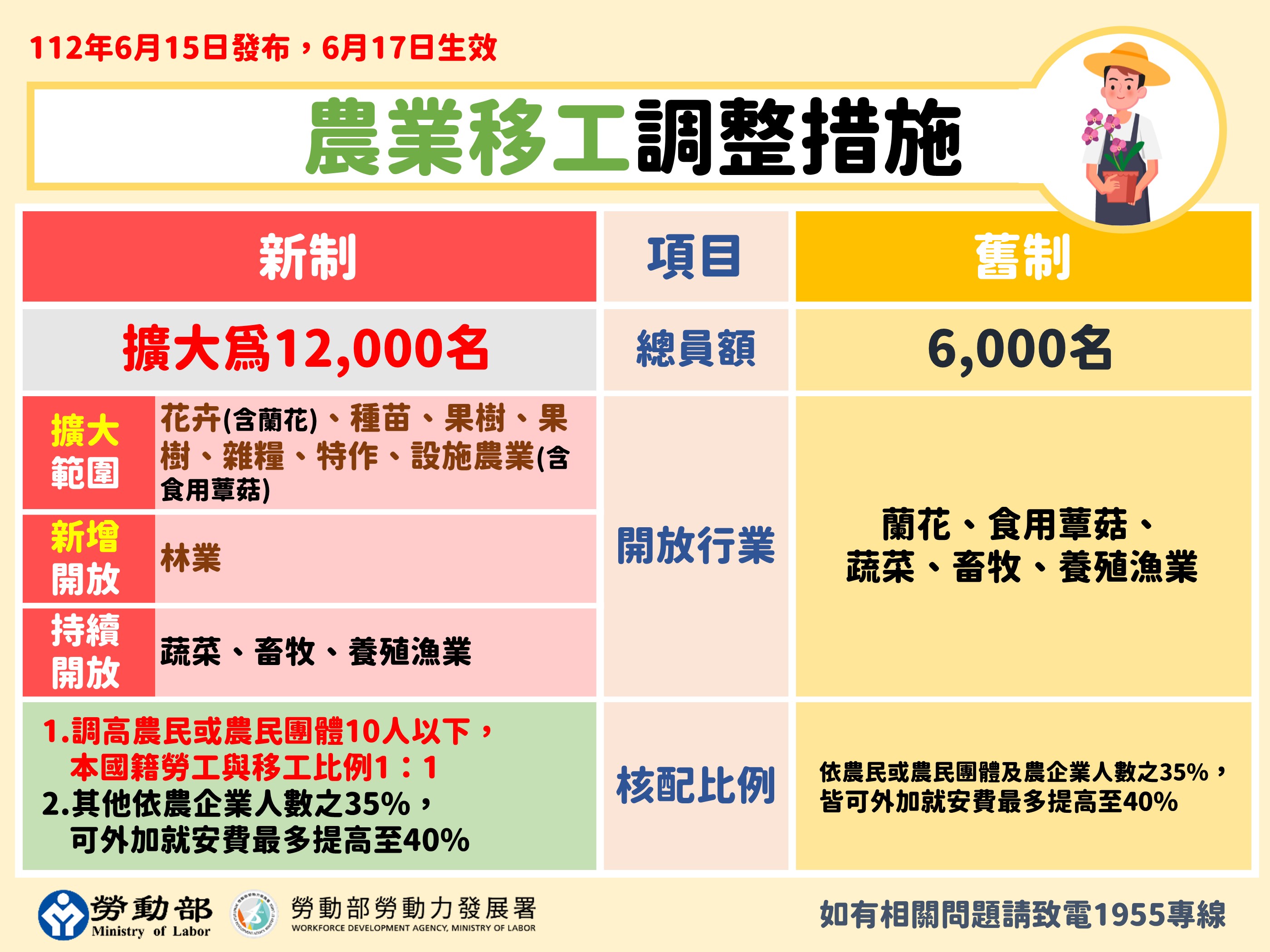 三、農業:調高10人以下小型農民或農民團體聘僱移工核配比率為本外勞1:1,另擴大放寬蔬菜、果樹、種苗、花卉、雜糧、咖啡、茶葉等特殊作物及溫室設施作物等農糧產業申請移工資格,並新開放林業伐木及造林工作,也可申請移工。