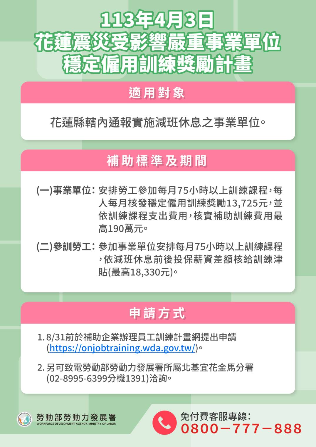 ✸ 「中華民國113年4月3日花蓮震災受影響嚴重事業單位穩定僱用訓練獎勵計畫」 6月1日發布施行.ᐟ.ᐟ