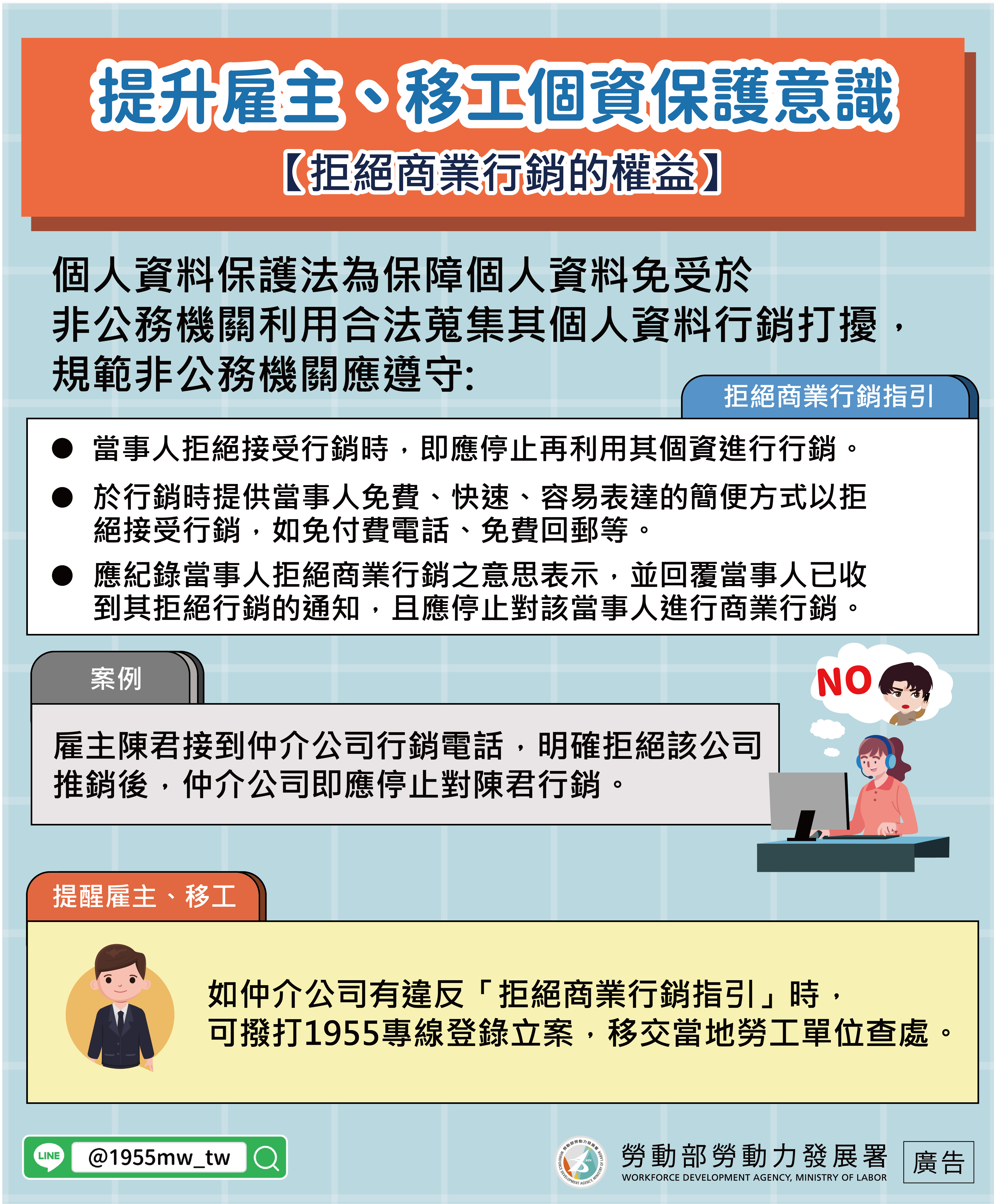 如仲介公司有違反「拒絕商業行銷指引」時,可撥打1955專線登錄立案,移交當地勞工單位查處。