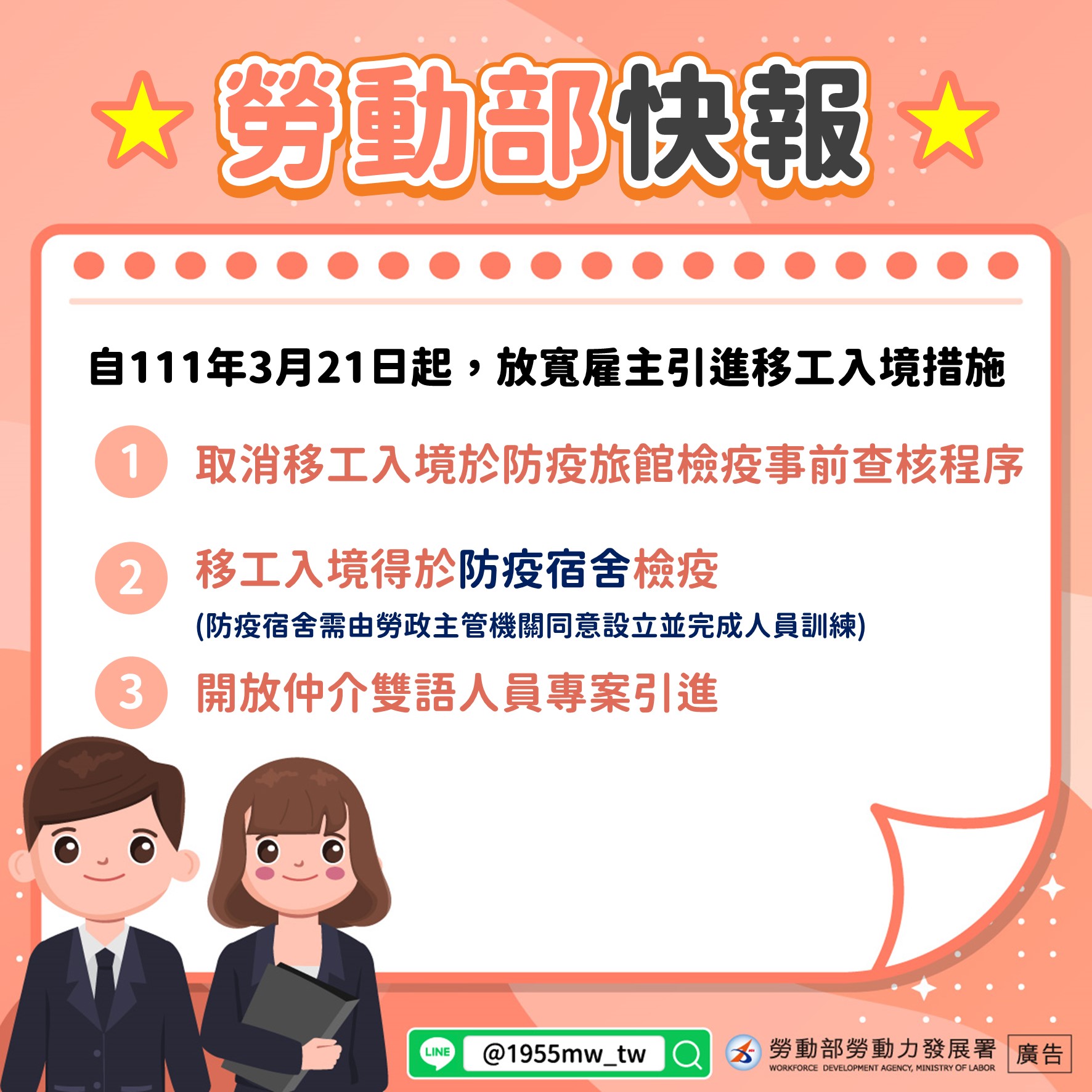 自即(21)日起,放寬移工入境得於防疫宿舍檢疫,取消移工入境於防疫旅館檢疫事前查核程序;開放仲介雙語人員專案引進。