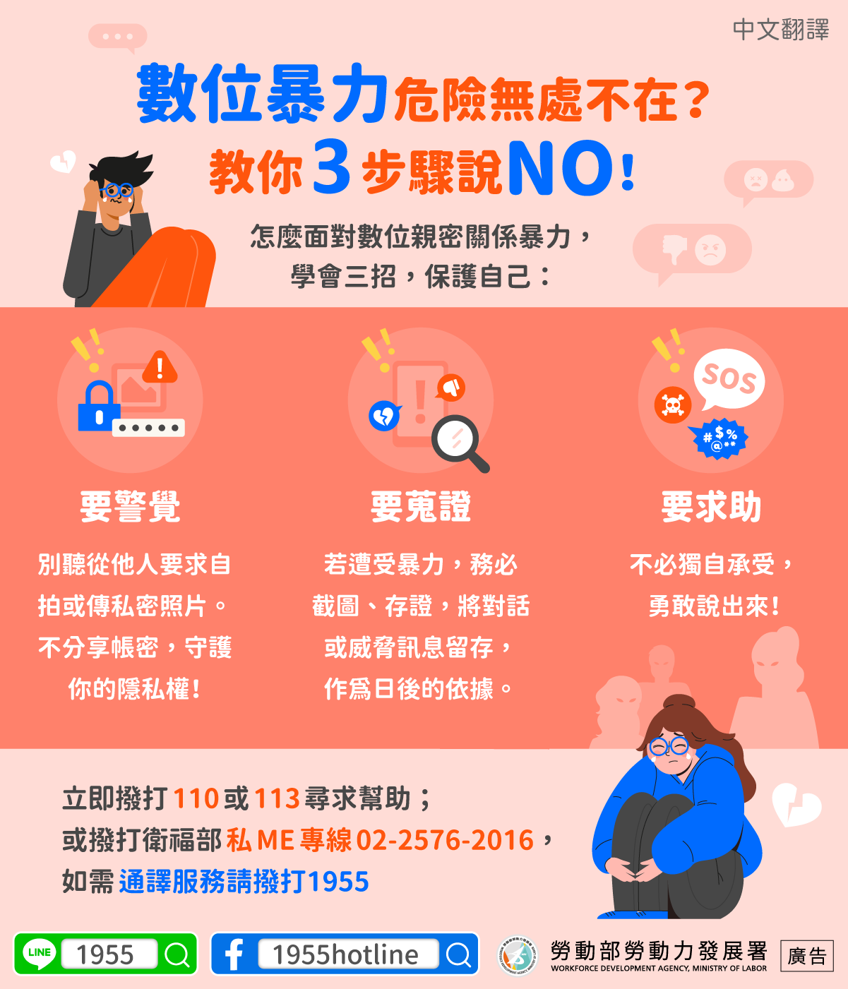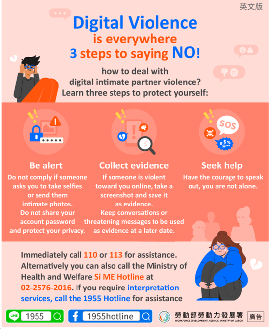 立即撥打 110 或 113 尋求幫助;或撥打衛福部 私 ME 專線 02-2576-2016,如需 通譯服務請撥打1955