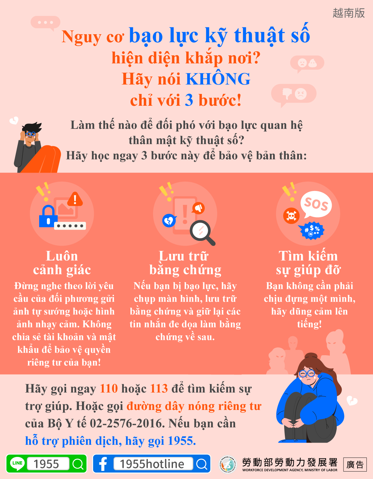 Hãy gọi ngay 110 hoặc 113 để tìm kiếm sự trợ giúp. Hoặc gọi đường dây nóng riêng tư của Bộ Y tế 02-2576-2016. Nếu bạn cầnhỗ trợ phiên dịch, hãy gọi 1955.