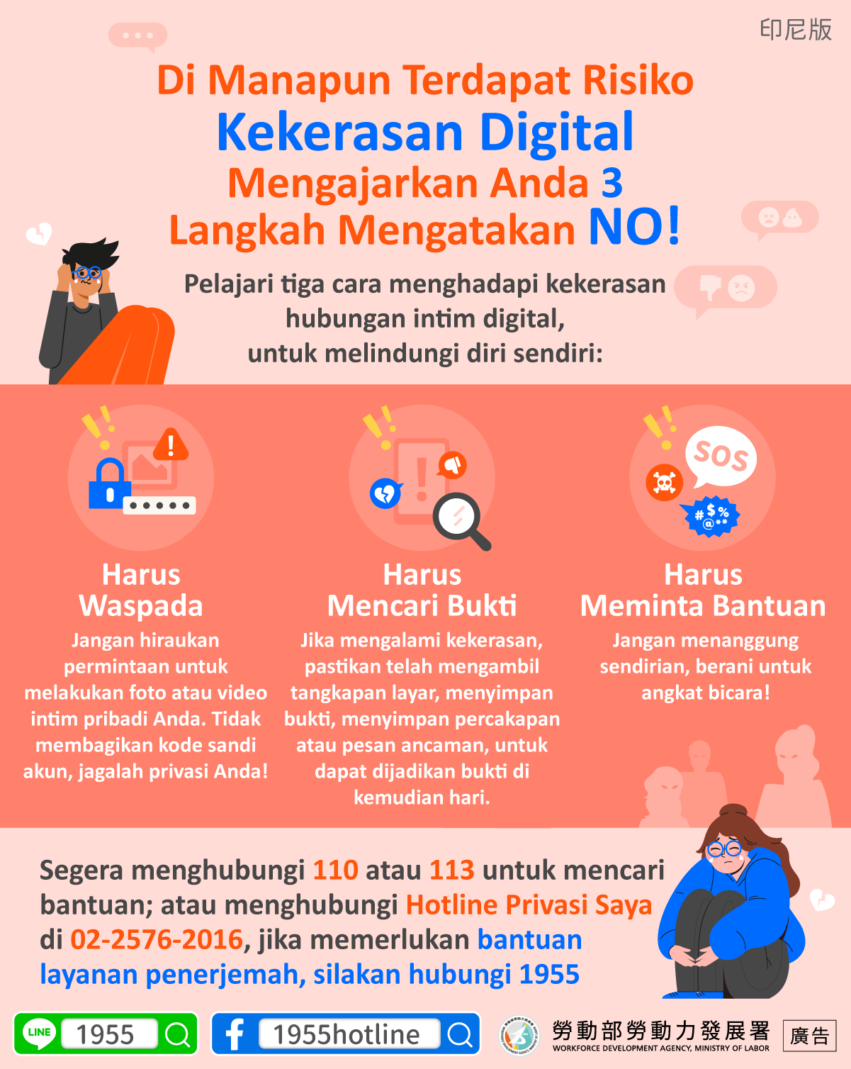 Segera menghubungi 110 atau 113 untuk mencari bantuan; atau menghubungi Hotline Privasi Saya di 02-2576-2016, jika memerlukan bantuan layanan penerjemah, silakan hubungi 1955