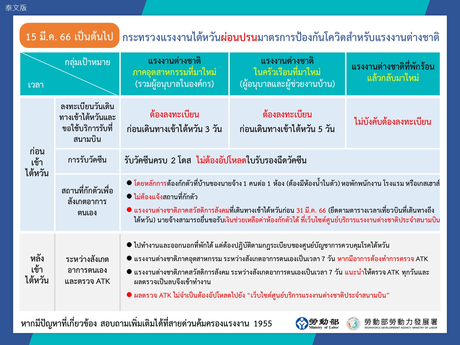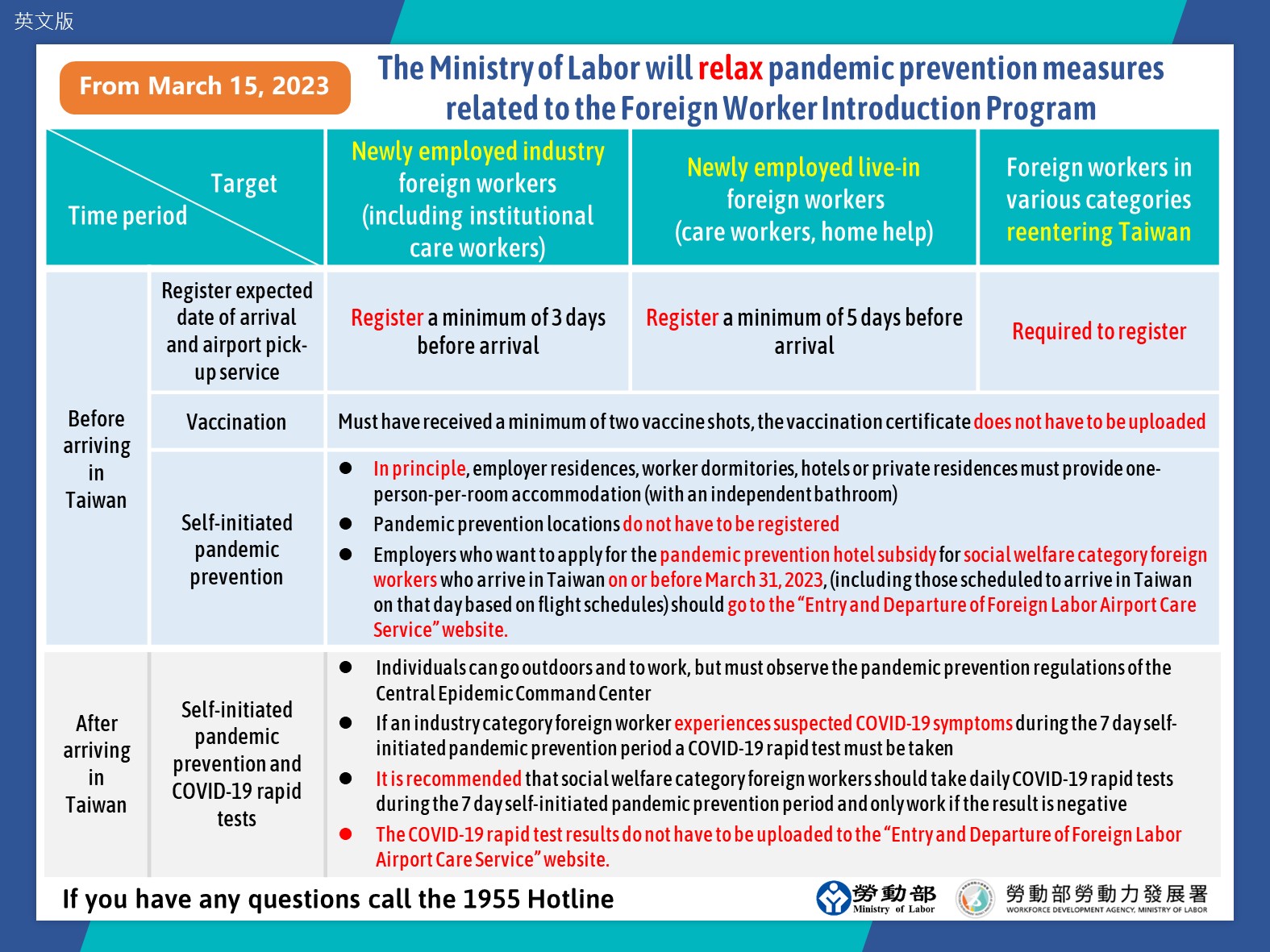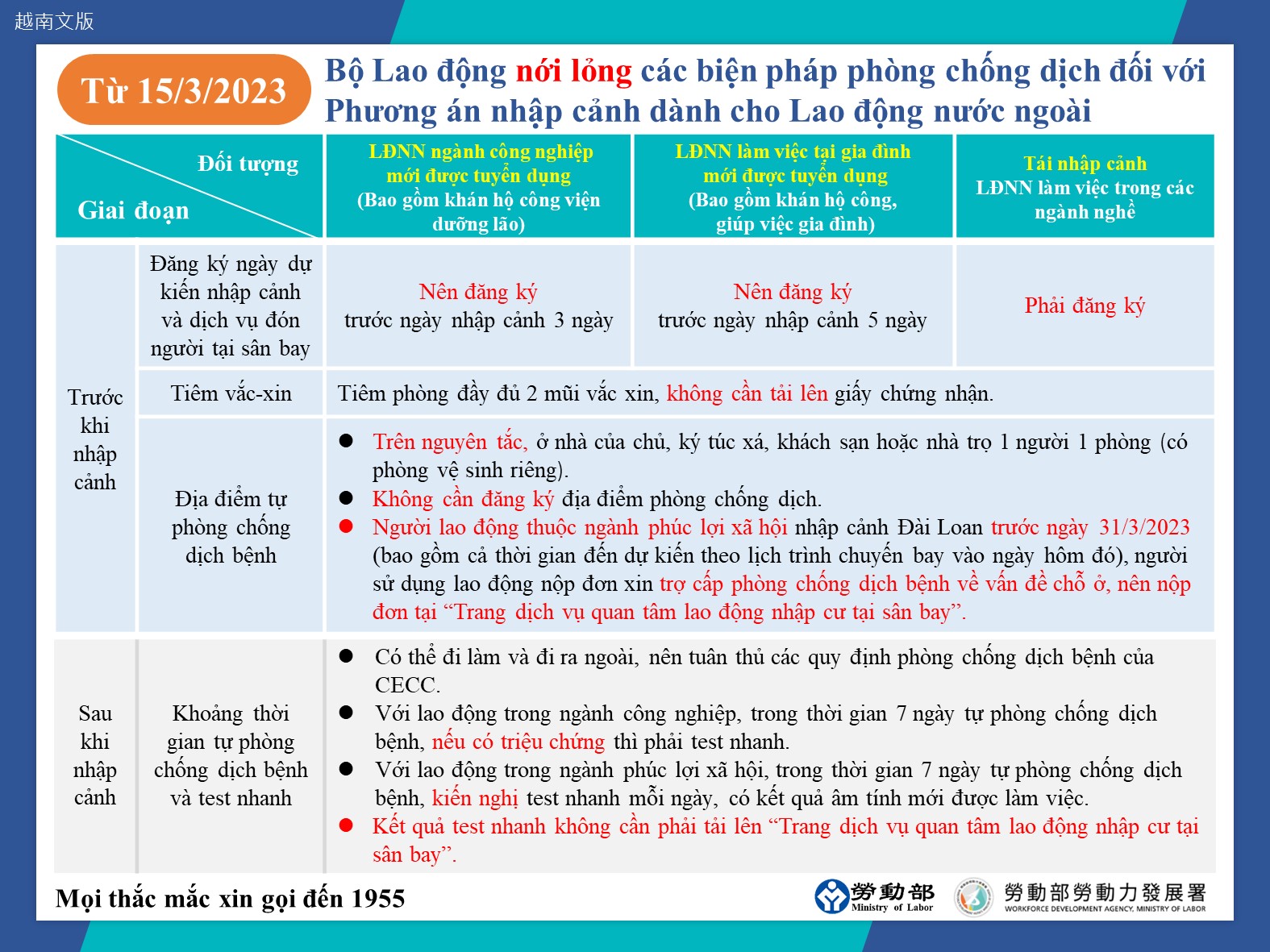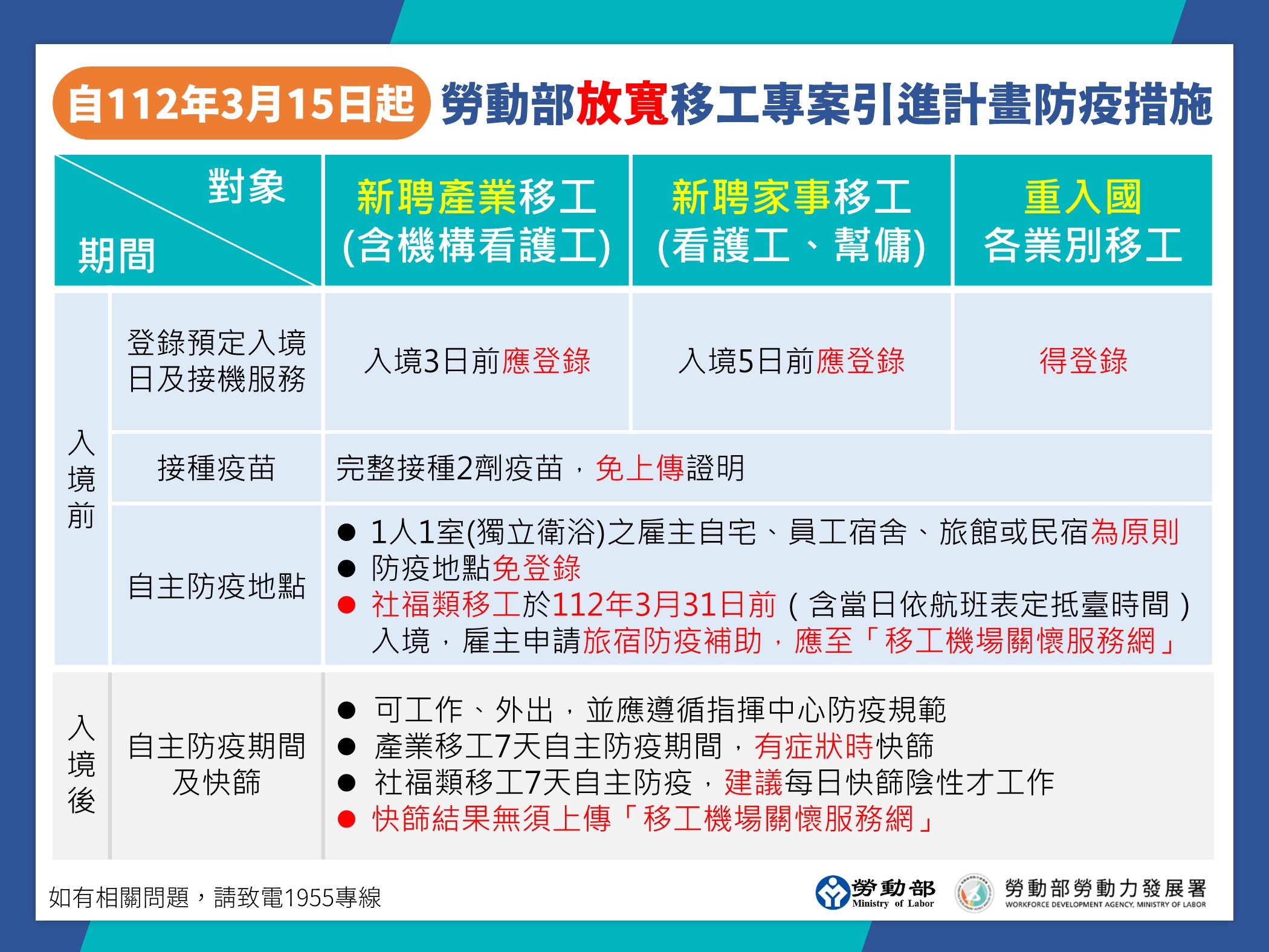 國內疫情趨緩且穩定可控,為兼顧國內雇主用人需求,勞動部報經指揮中心同意,將從112年3月15日起鬆綁移工入境自主防疫地點,改以安排1人1室、獨立衛浴地點為原則,入境移工有症狀才快篩且結果無需上傳勞動部機場關懷服務網等措施。