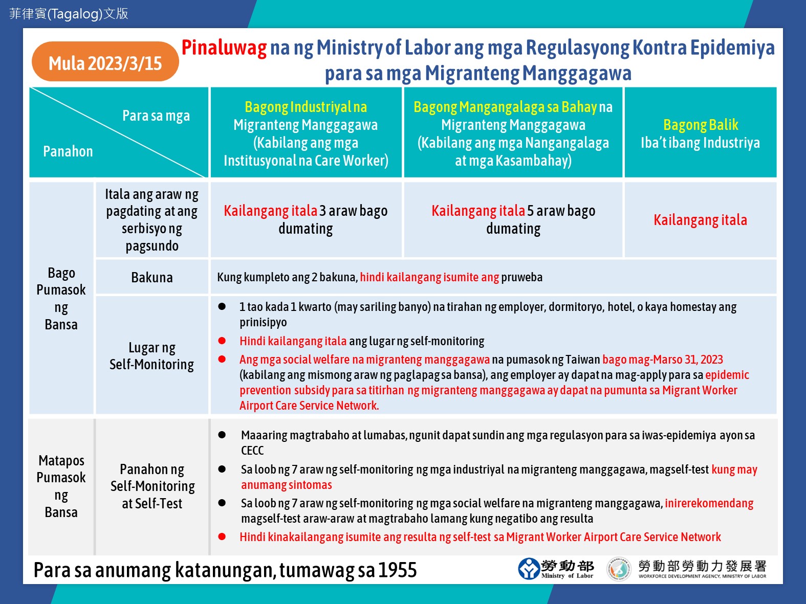 現行規範社福移工於自主防疫期間工作,需每日快篩陰性並上傳部分,勞動部表示自3月15日起進一步鬆綁,社福移工有因工作需接觸65歲以上、6歲以下、免疫不全或免疫低下等重症高風險對象情形者,建議雇主協助移工於每日工作前進行快篩。另移工如須隨同被看護者至醫療或長照機構工作,應遵守指揮中心篩檢規定。