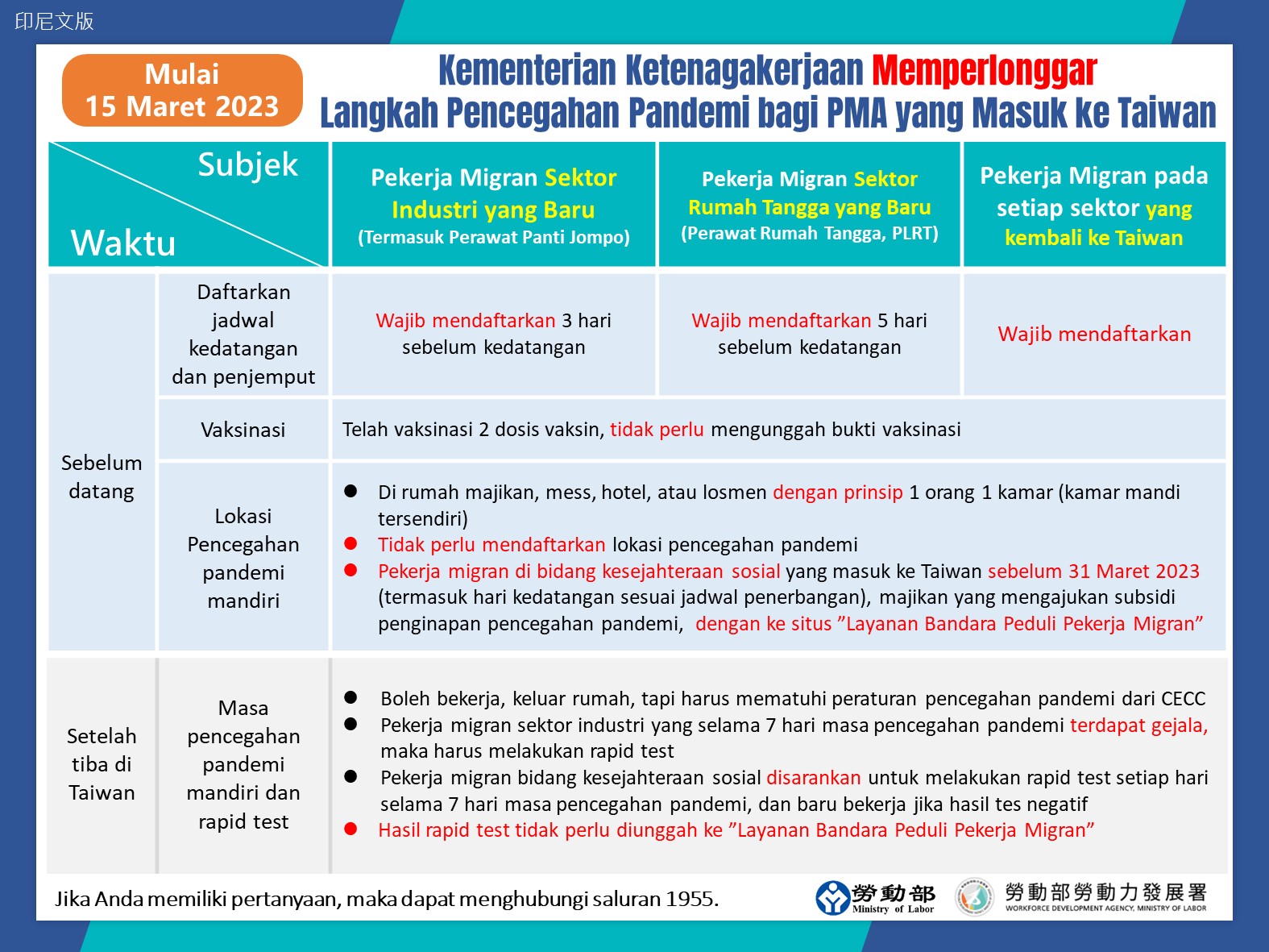 勞動部提醒,考量社福移工入境自主防疫地點已放寬,如雇主安排社福移工入境於旅館辦理自主防疫,本部補助旅宿費用之50%,其實施期限至社福移工於「112年3月31日(含當日航班表定抵臺時間)」入境止,並應至勞動部網站登錄及申請,有意申請之雇主應注意申請期限。