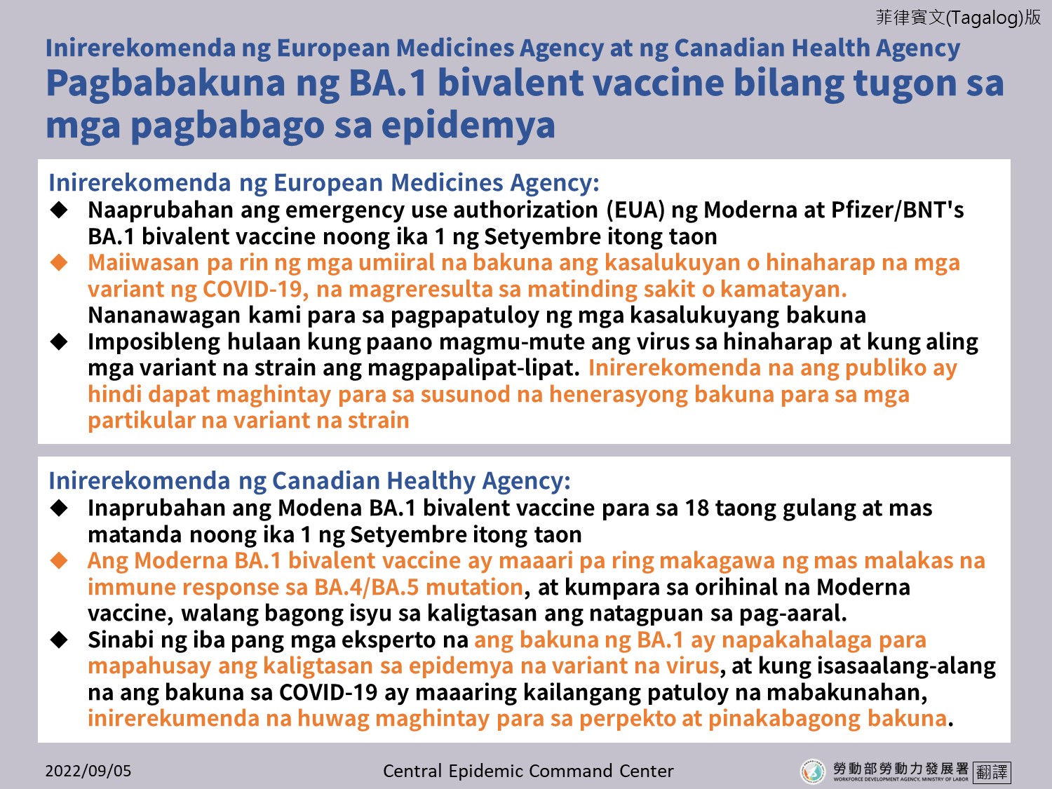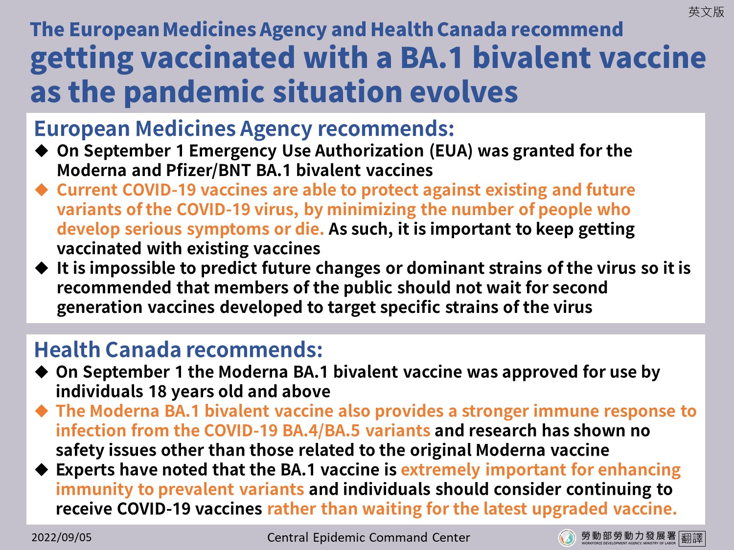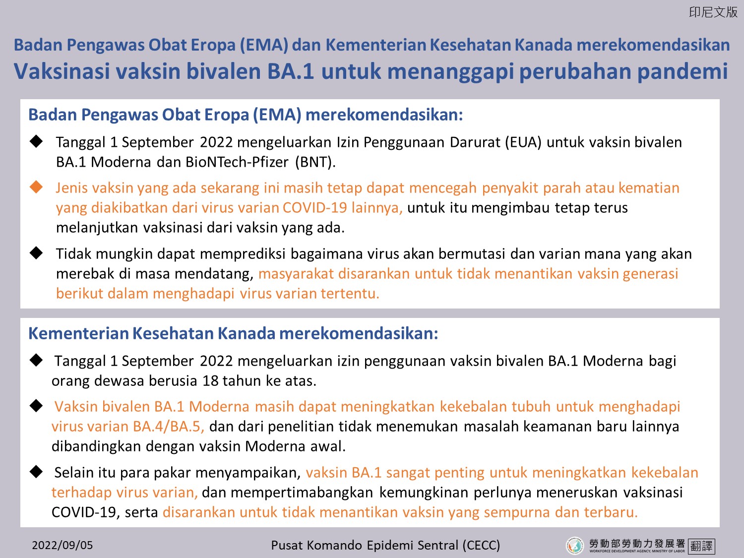 (中央流行疫情指揮中心)歐洲藥品管理局及加拿大衛生部均建議 接種BA.1雙價疫苗因應疫情變化-多國語版本