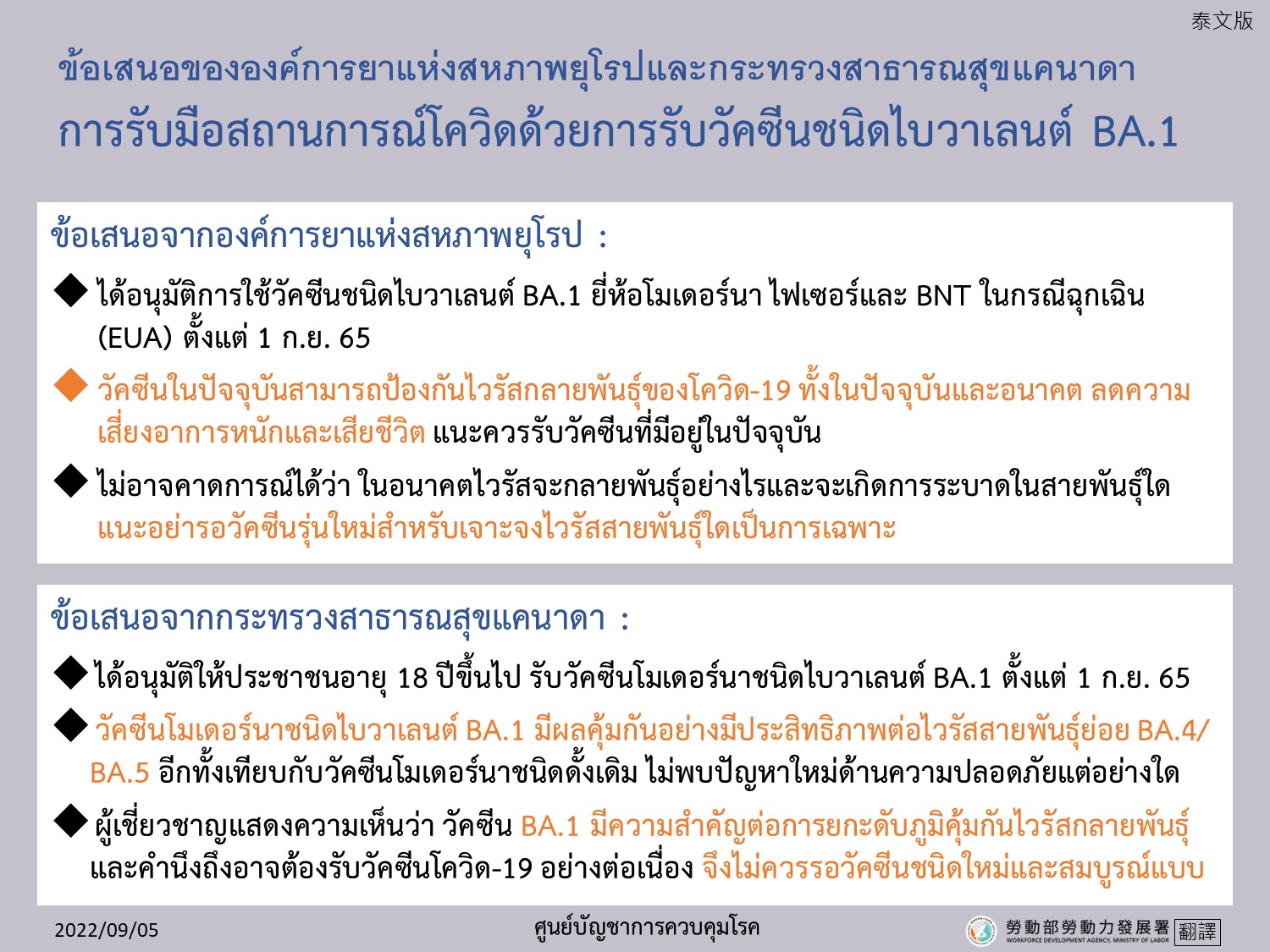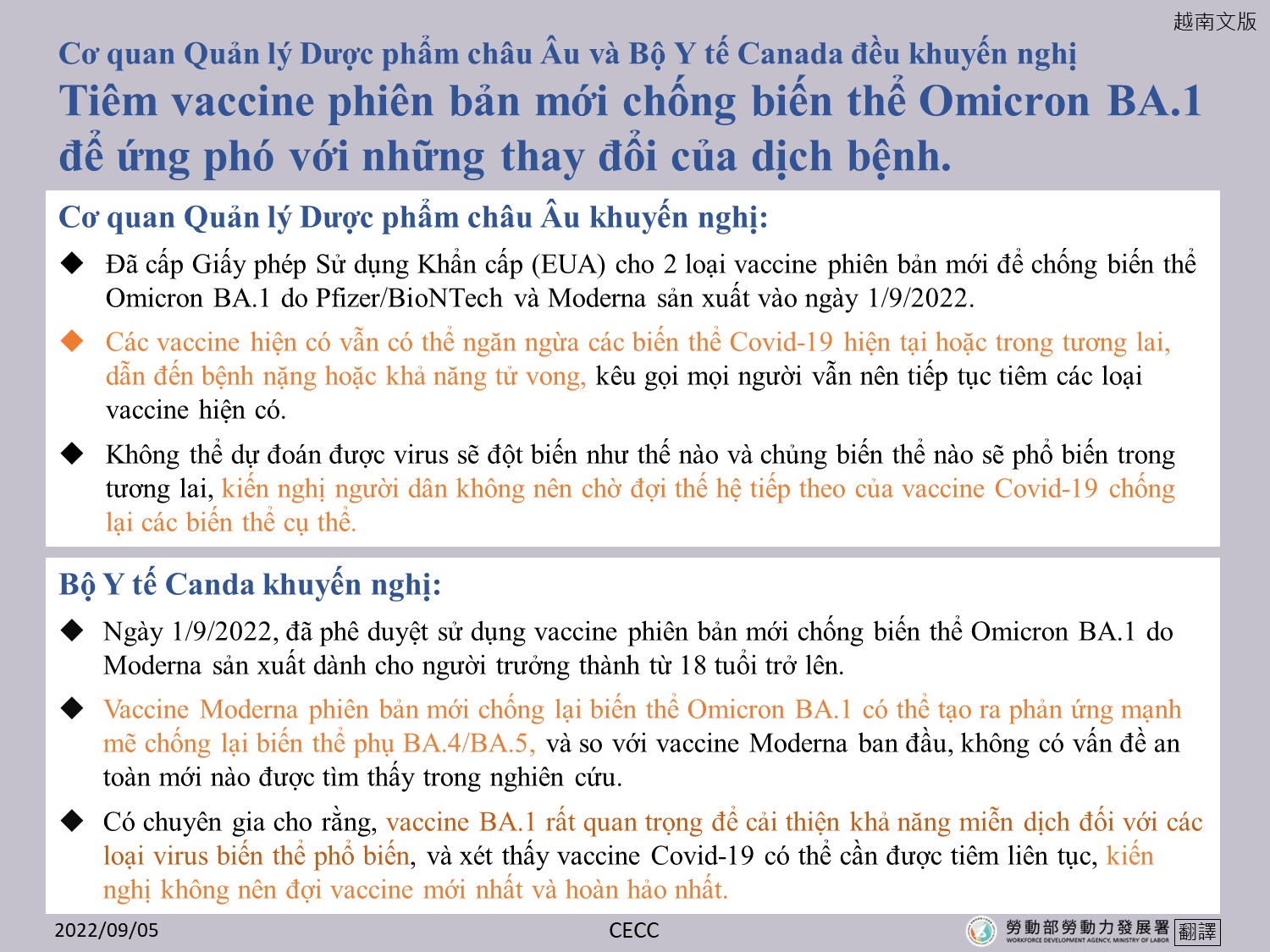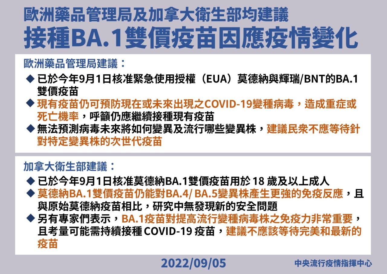 (中央流行疫情指揮中心)歐洲藥品管理局及加拿大衛生部均建議 接種BA.1雙價疫苗因應疫情變化-多國語版本