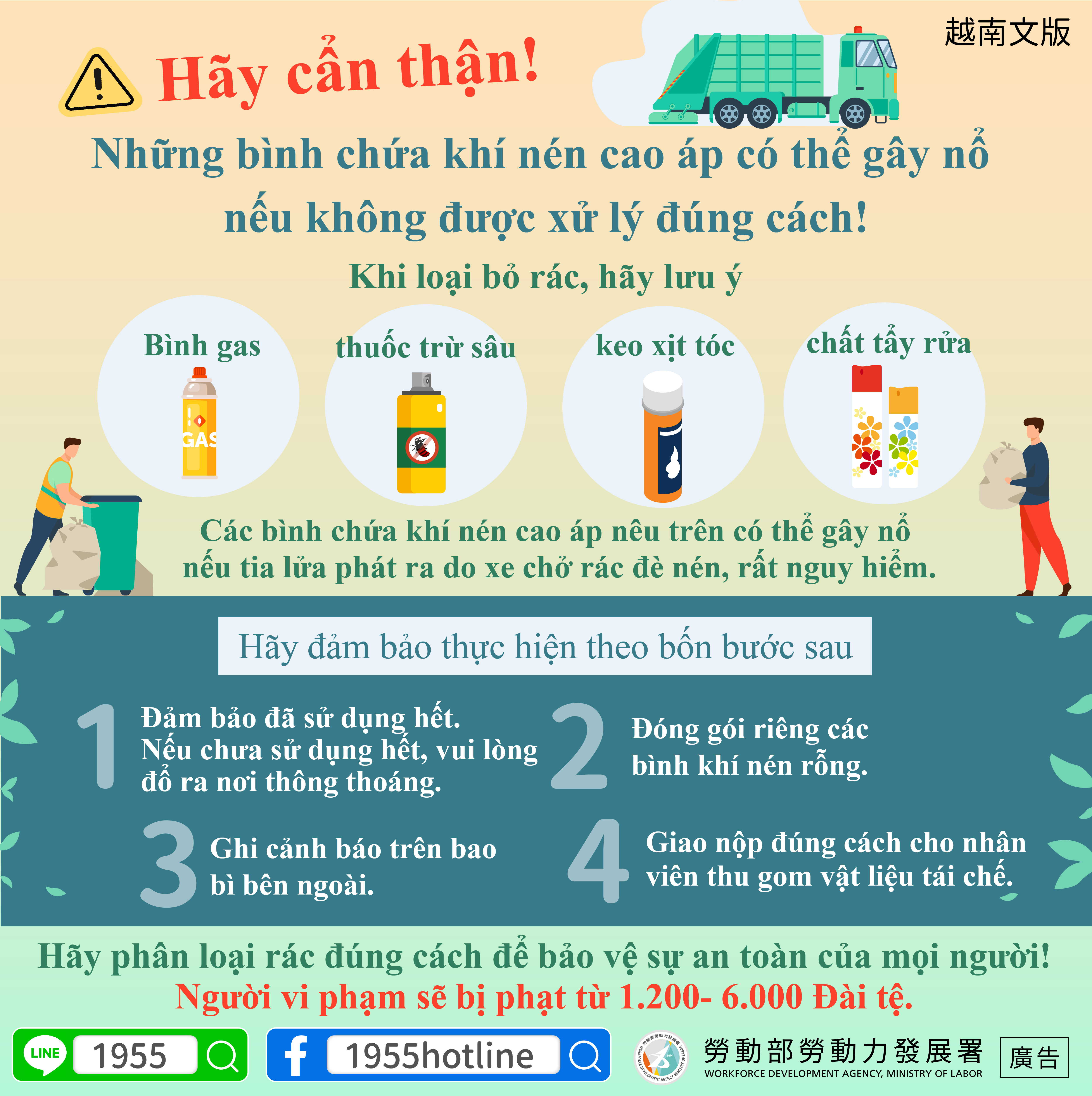 Khi loại bỏ rác, hãy lưu ý Bình gas、thuốc trừ sâu、keo xịt tóc、chất tẩy rửa Các bình chứa khí nén cao áp nêu trên có thể gây nổ nếu tia lửa phát ra do xe chở rác đè nén, rất nguy hiểm.