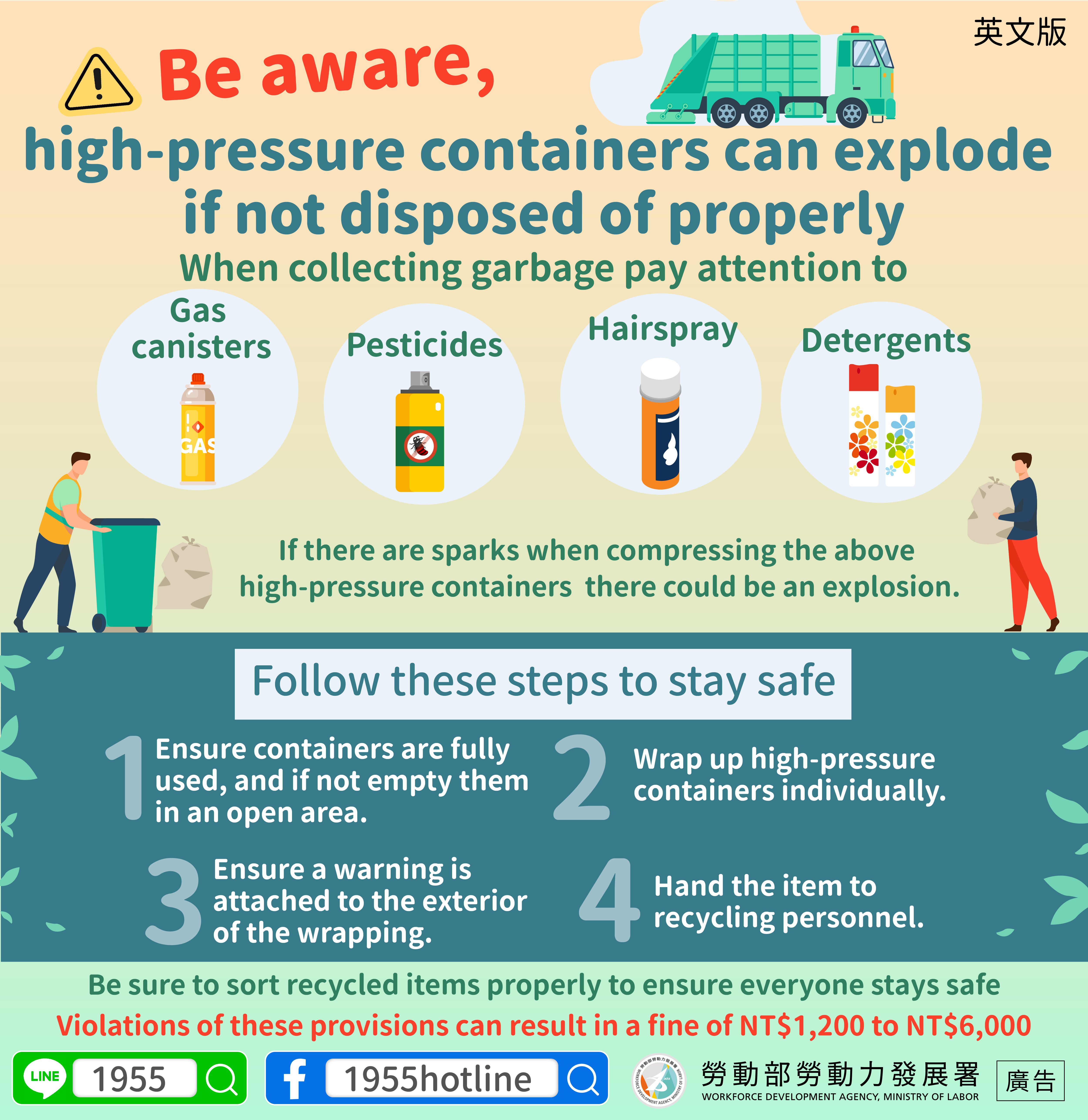 在垃圾清運時,請注意瓦斯罐、殺蟲劑、髮膠、清潔劑;上述高壓容器,若因垃圾車壓縮產生火花,可能會引發爆炸,十分危險
