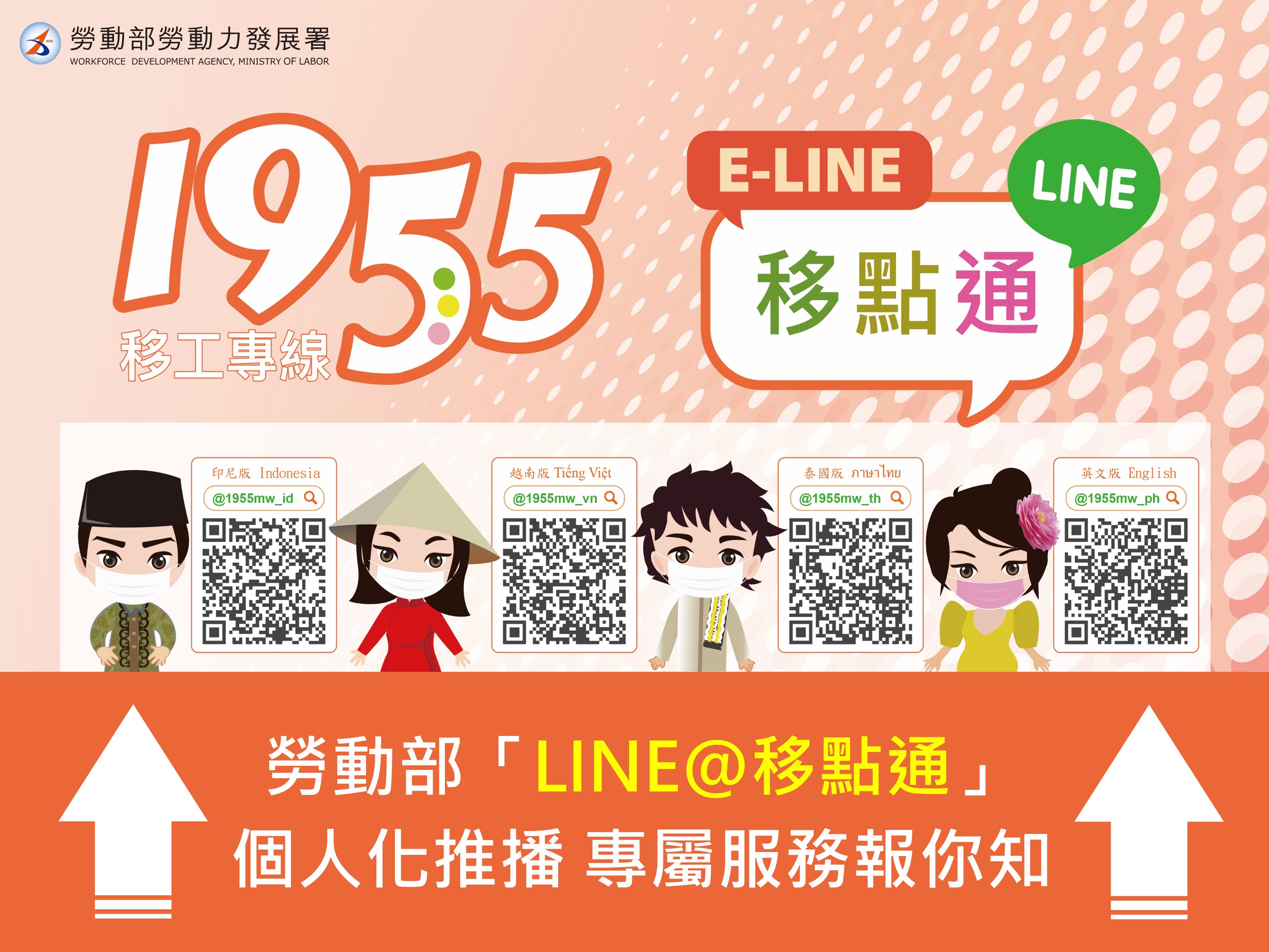 另透過「LINE@移點通」亦可連結至1955真人文字客服人員,提供母語線上文字對談方式諮詢,即時移工解決問題,如有緊急申訴事件,可主動轉接1955專線進一步處理。