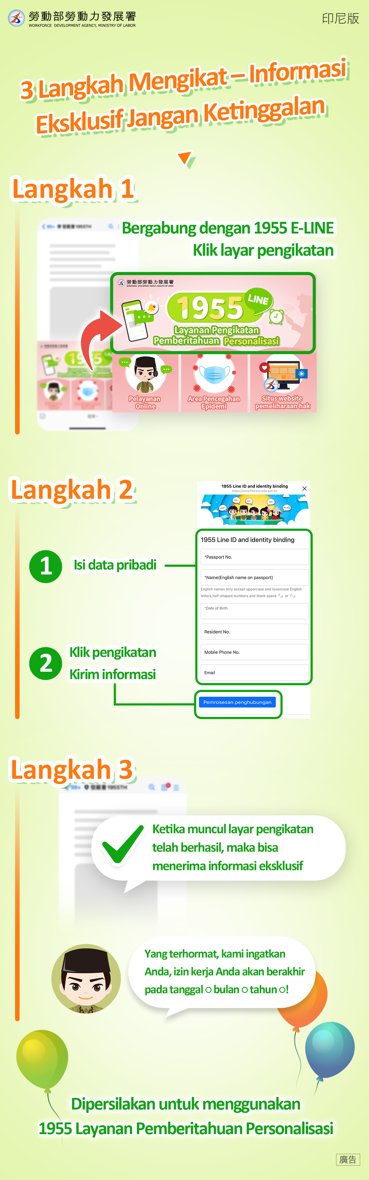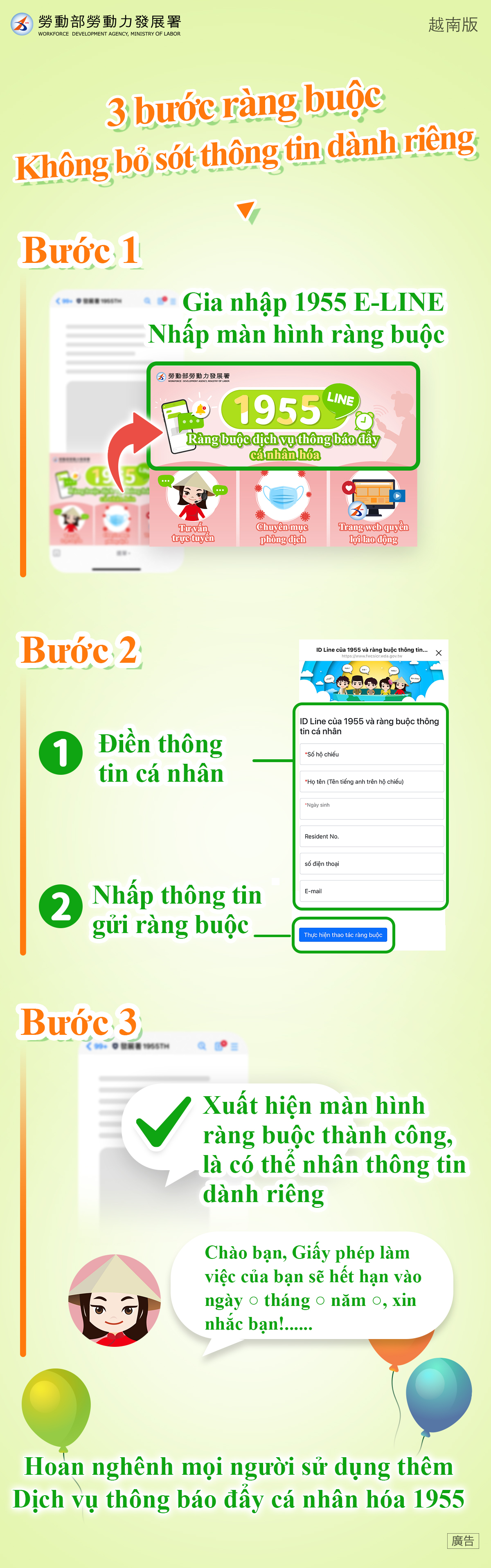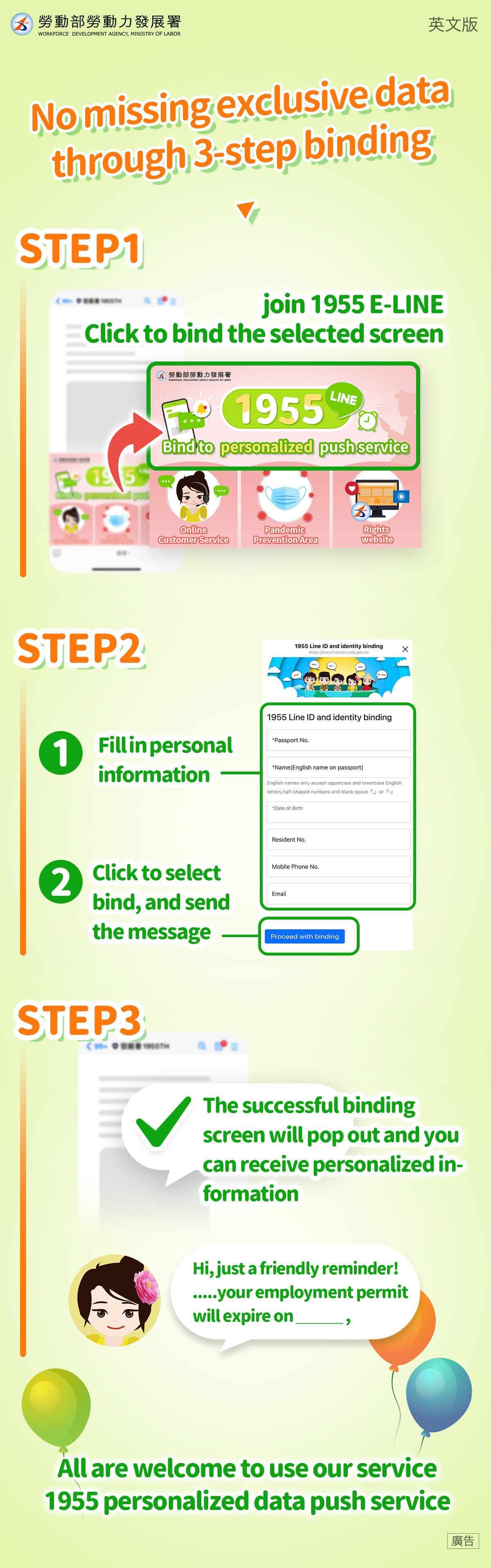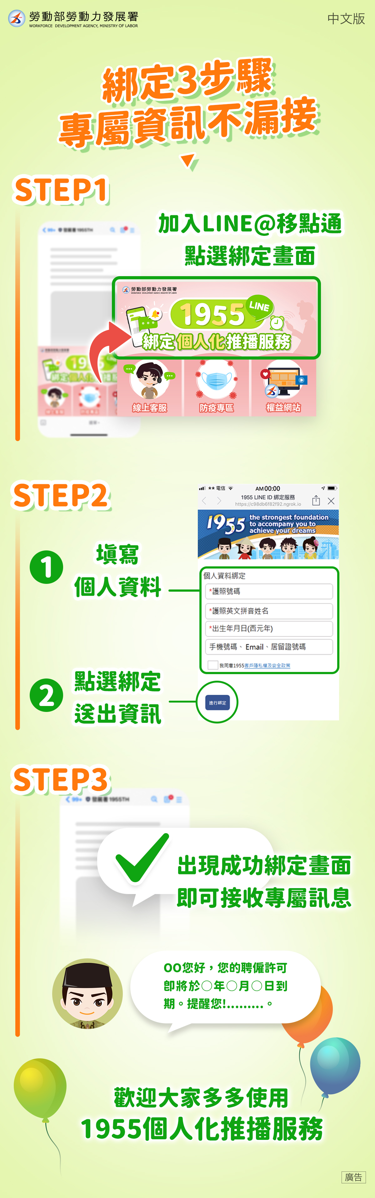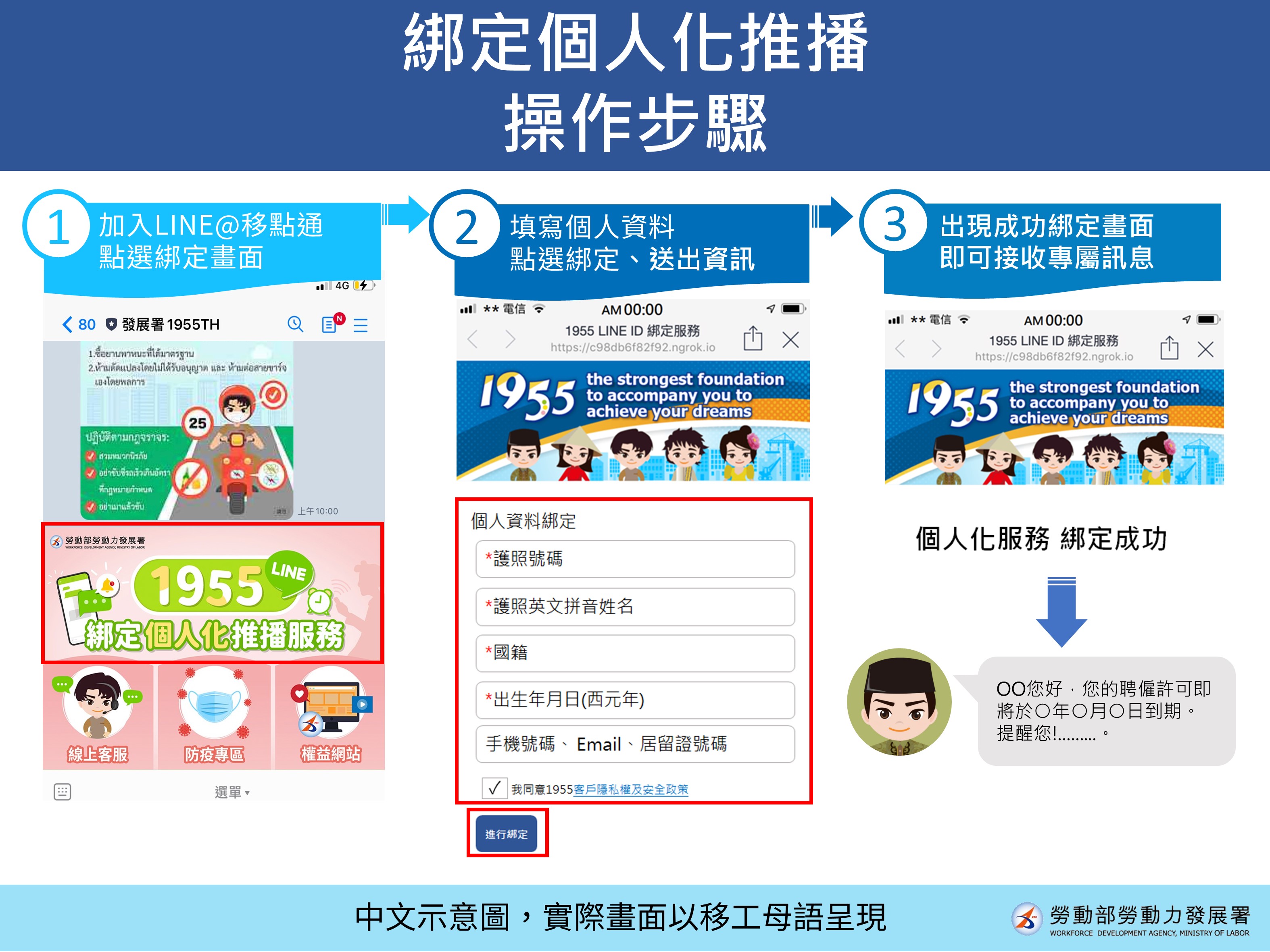 過去1955專線時接獲移工反映,因不熟悉中文及相關聘僱法令,而有聘僱許可文件被扣留不能知悉聘僱期間或居留期限,或經雇主或仲介惡意通報移工行蹤不明,使移工遭廢止聘僱許可並限制出境,工作權益受損需1955專線協助,為讓移工能掌握個人的聘僱資訊,改善這些問題,勞動部開發「LINE@移點通」服務,使移工可在「LINE@移點通」綁定個人資料,只要在「LINE@移點通」選擇「1955綁定個人化推播服務」,進入綁定畫面後,填寫移工個人護照號碼、居留證號、姓名、出生年月日及手機號碼等,1分鐘內即可以完成綁定手續(參考附圖)。