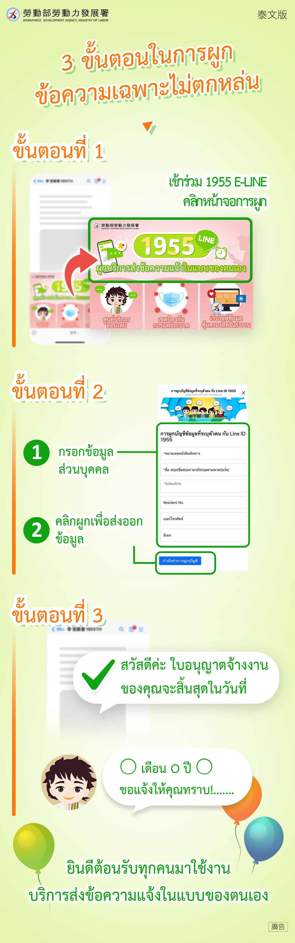 勞動部說明,明(111)年度再增加個人化推播服務提醒,如核發聘僱許可、廢止聘僱許可及雇主通報行蹤不明時,同步推播予移工知悉,避免未收到聘僱或廢聘文件產生工作權益問題,也避免移工被謊報行蹤不明而失去在臺工作權利,亦規劃有居留證到期、健康檢查等資訊提醒。勞動部推動個別化專屬資訊推播,希望移工趕快加入LINE@及進行綁定,以隨時獲知重要疫情、工作權益資訊,也即時掌握個人聘僱資訊,安心、安全的在臺工作。