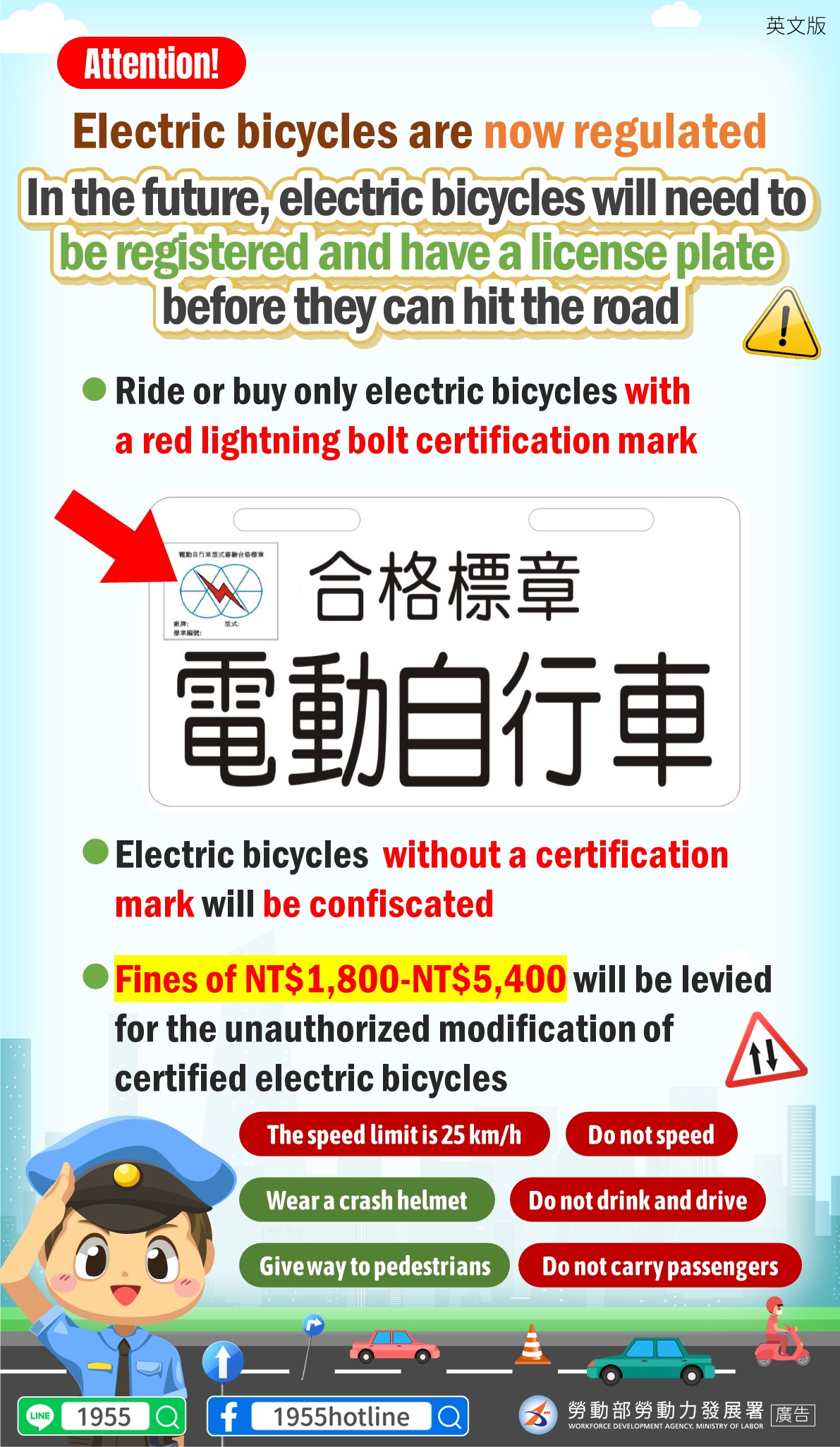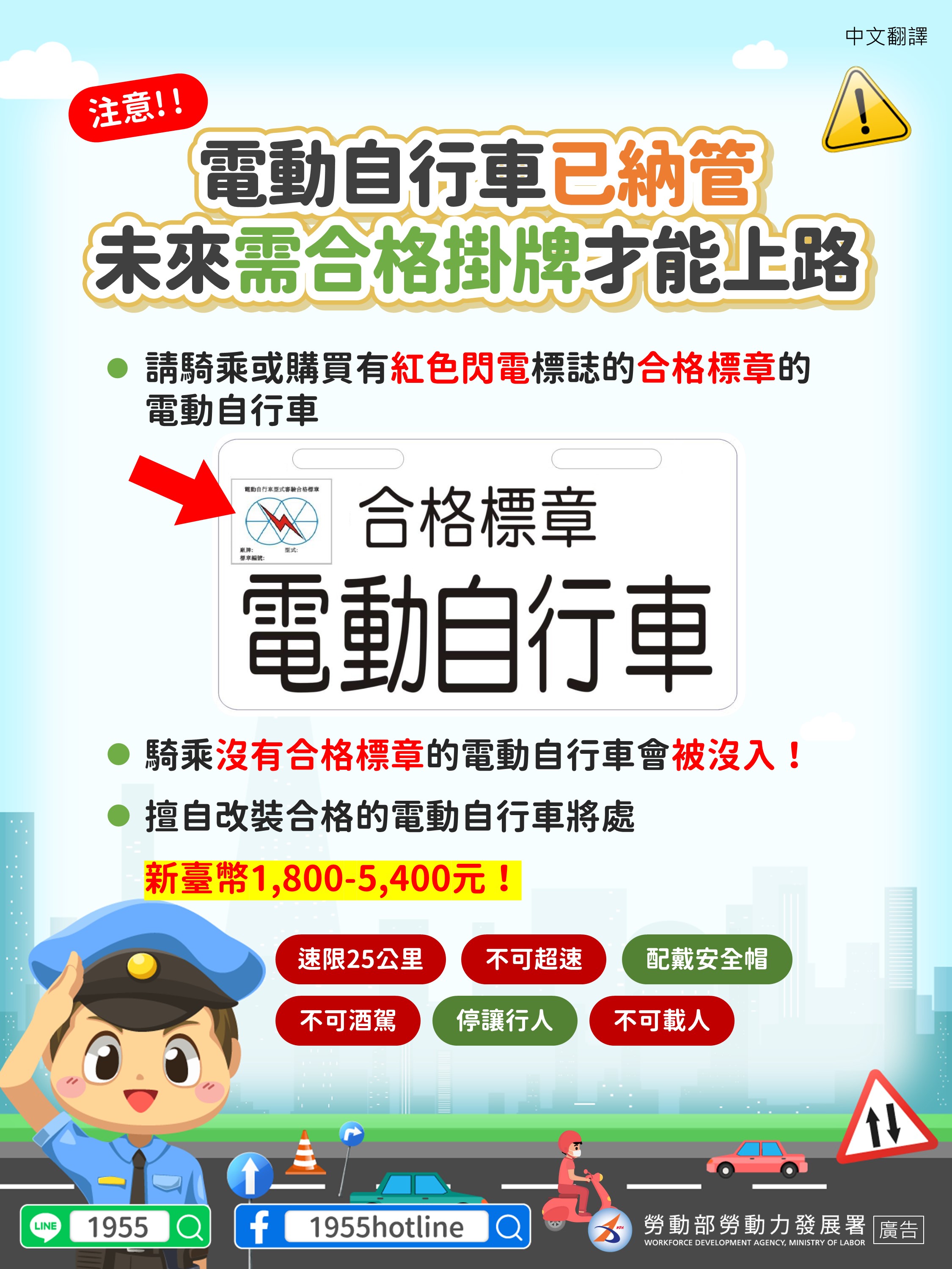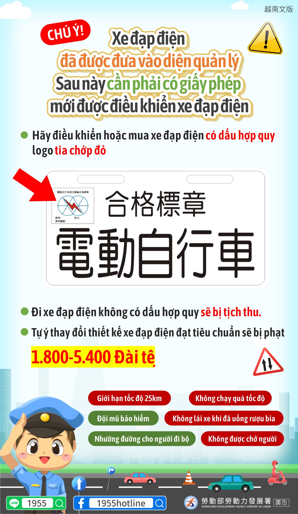 111年5月4日修正公布道路交通管理處罰條例,將電動自行車納管,未來電動自行車需合格掛牌才能上路,騎乘沒有合格標章的電動自行車將遭沒入,另擅自改裝合格的電動自行車將最高處新臺幣5,400元。勞動部提醒移工應購買有紅色閃電合格標章的電動自行車,且不得擅自改裝,也請雇主及仲介公司協助宣導,以免移工受罰。