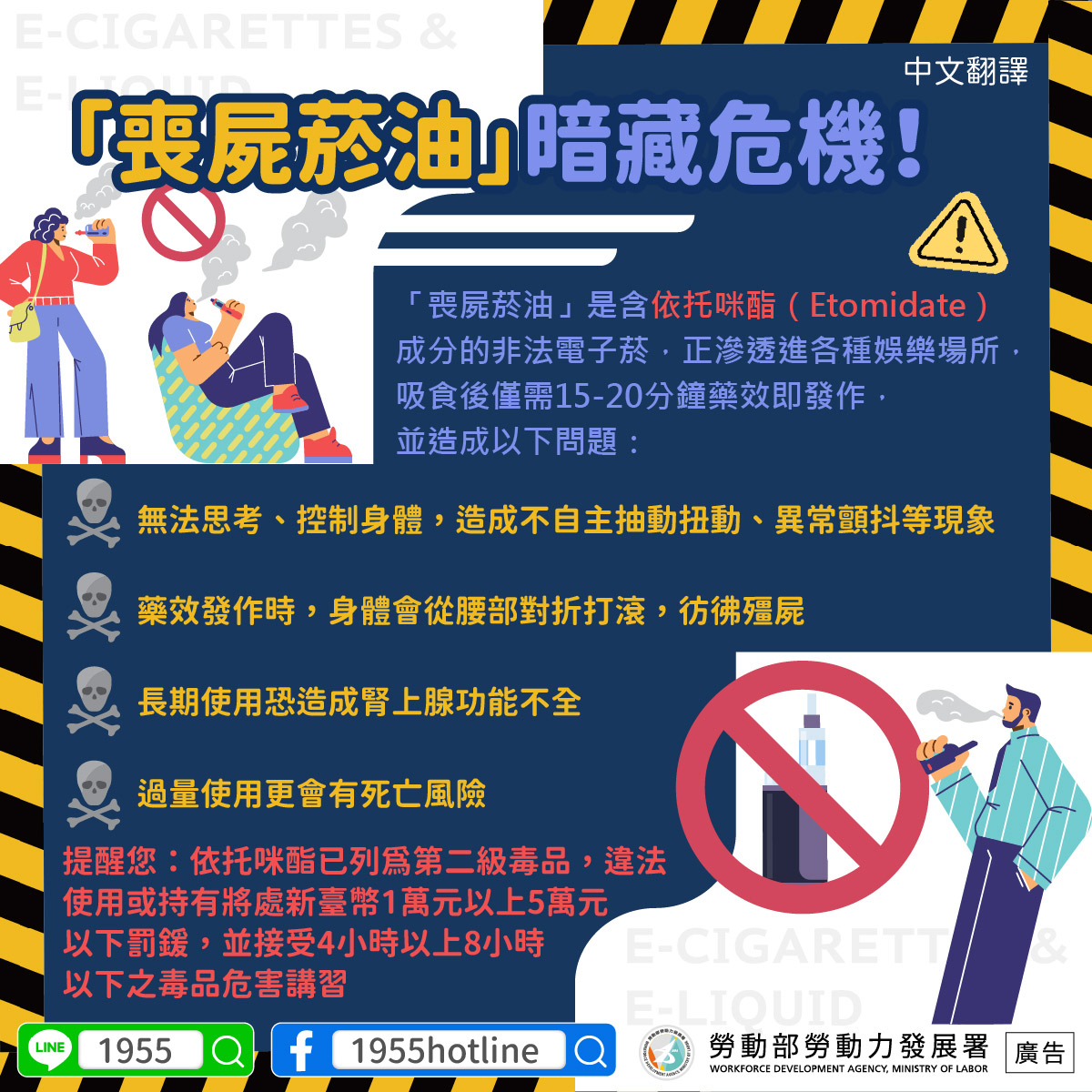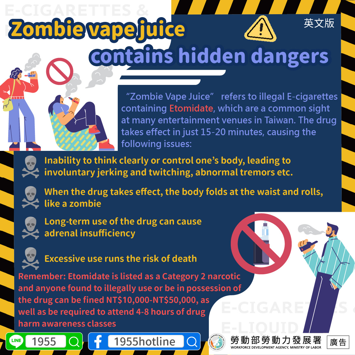 “Zombie Vape Juice” refers to illegal E-cigarettes containing Etomidate, which are a common sight at many entertainment venues in Taiwan. The drug takes effect in just 15-20 minutes, causing the following issues: