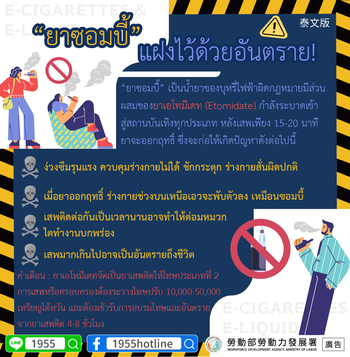 “ยาซอมบี้” เป็นน้ำยาของบุหรี่ไฟฟ้าผิดกฎหมายมีส่วนผสมของยาเอโทมีเดท (Etomidate) กำลังระบาดเข้าสู่สถานบันเทิงทุกประเภท หลังเสพเพียง 15-20 นาทียาจะออกฤทธิ์ ซึ่งจะก่อให้เกิดปัญหาดังต่อไปนี้
