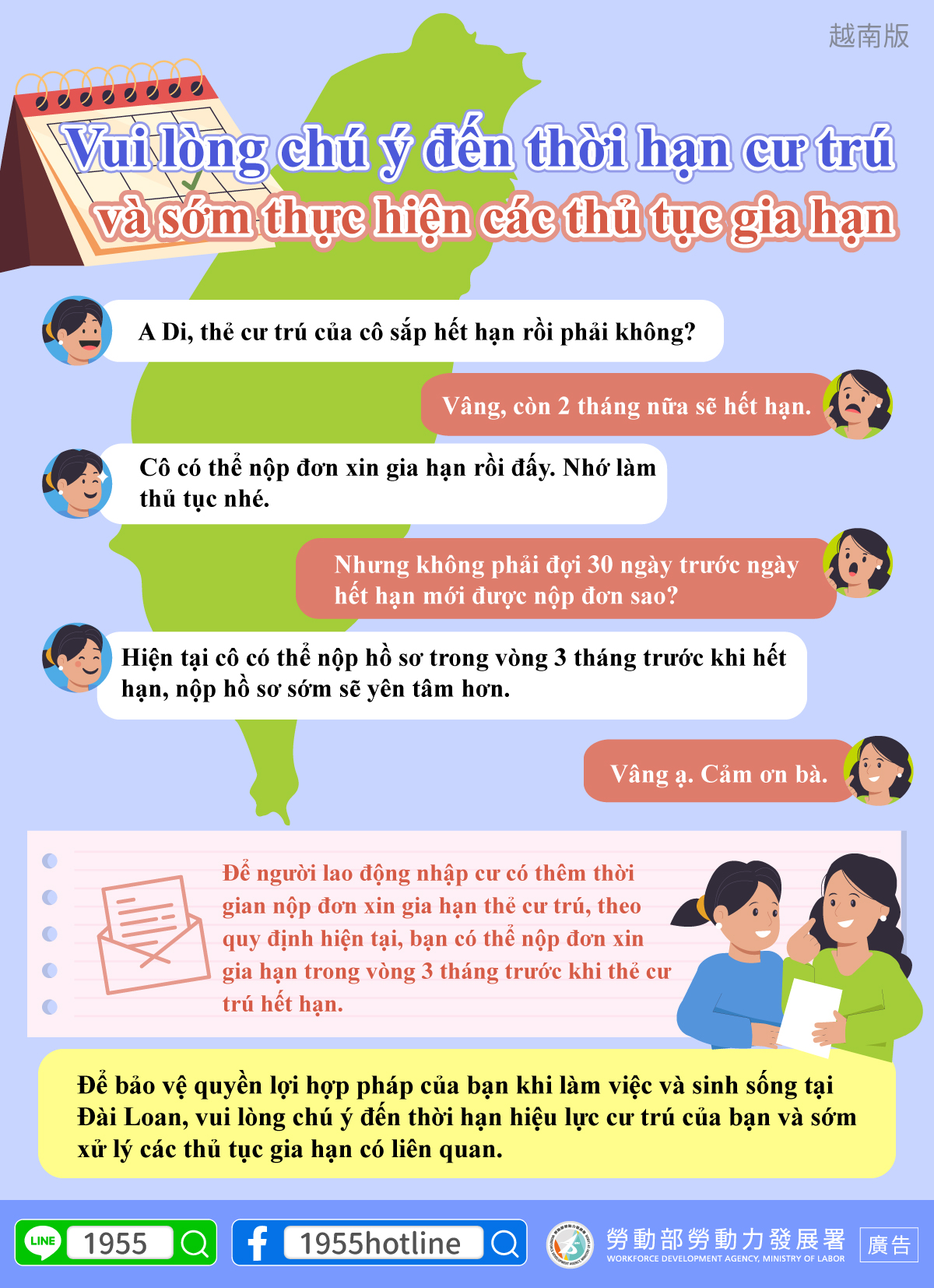 Để bảo vệ quyền lợi hợp pháp của bạn khi làm việc và sinh sống tại Đài Loan, vui lòng chú ý đến thời hạn hiệu lực cư trú của bạn và sớm xử lý các thủ tục gia hạn có liên quan.