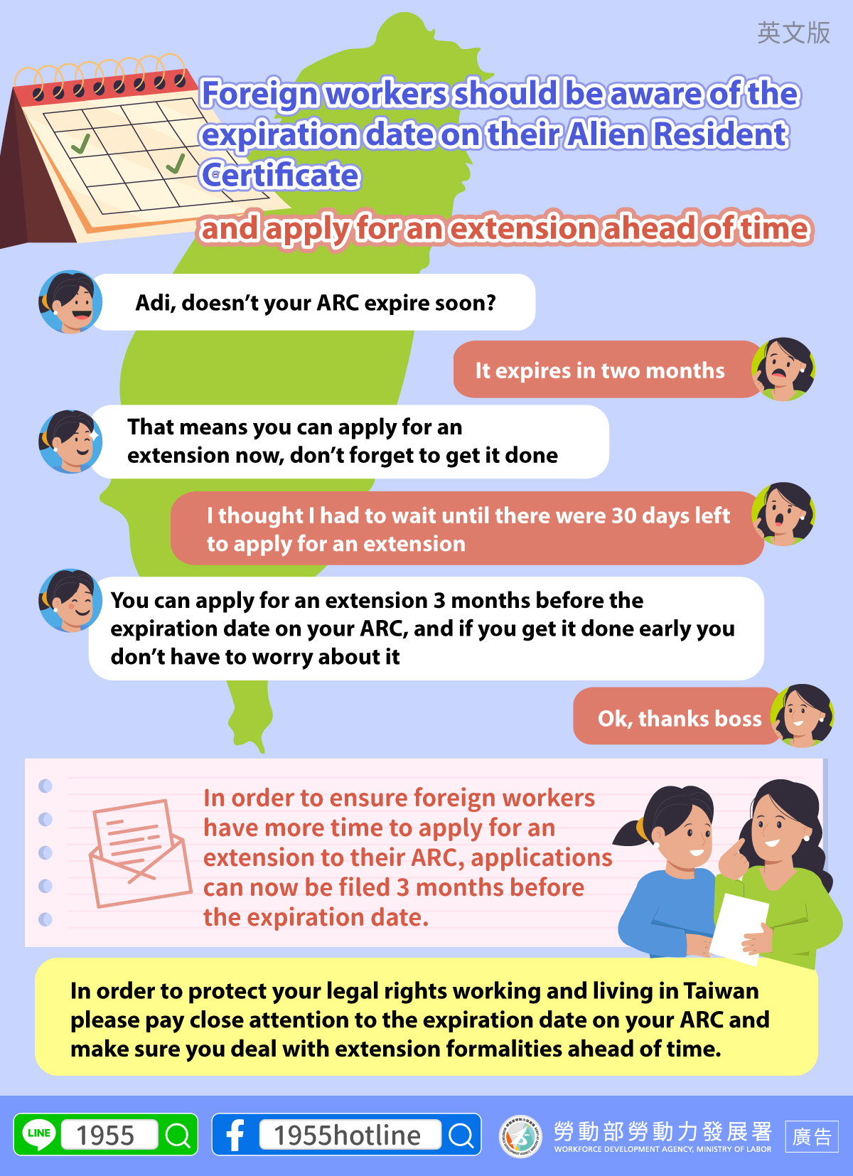 Untuk melindungi hak-hak legal Anda dalam bekerja dan hidup di Taiwan, harap perhatikan masa berlaku ARC Anda dan lakukan prosedur perpanjangan lebih awal.