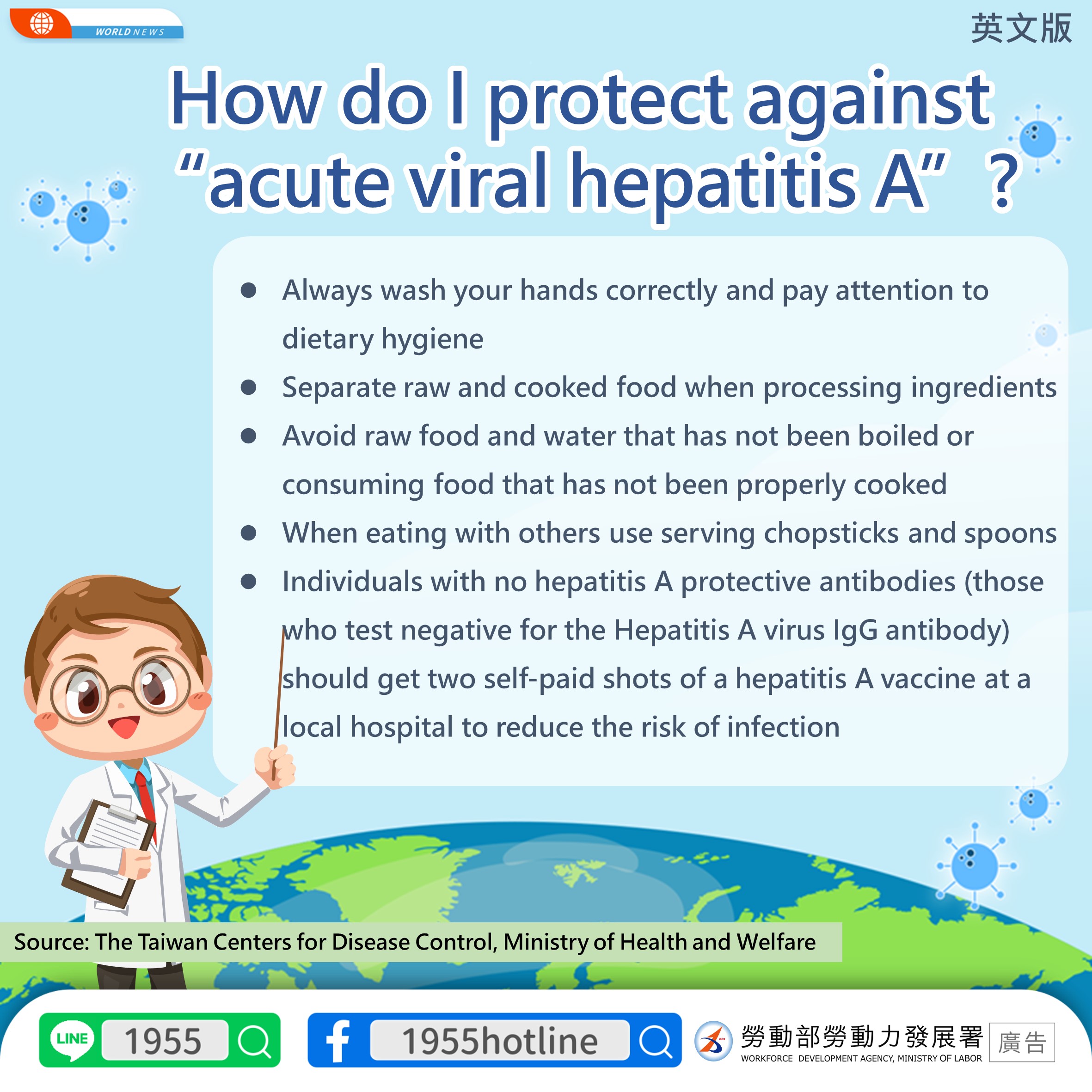 *Individuals with no hepatitis A protective antibodies (those who test negative for the Hepatitis A virus IgG antibody) should get two self-paid shots of a hepatitis A vaccine at a local hospital to reduce the risk of infection