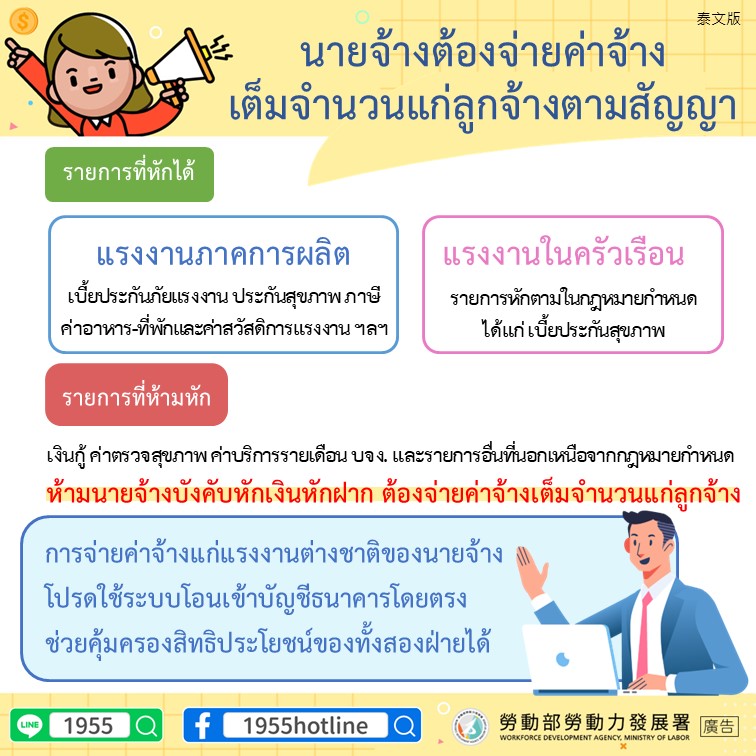 การจ่ายค่าจ้างแก่แรงงานต่างชาติของนายจ้าง โปรดใช้ระบบโอนเข้าบัญชีธนาคารโดยตรง ช่วยคุ้มครองสิทธิประโยชน์ของทั้งสองฝ่ายได