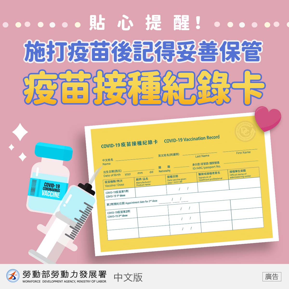 1.打完疫苗後,除了要持續戴口罩、勤洗手外,也要妥善保管COVID-19疫苗接種紀錄卡!