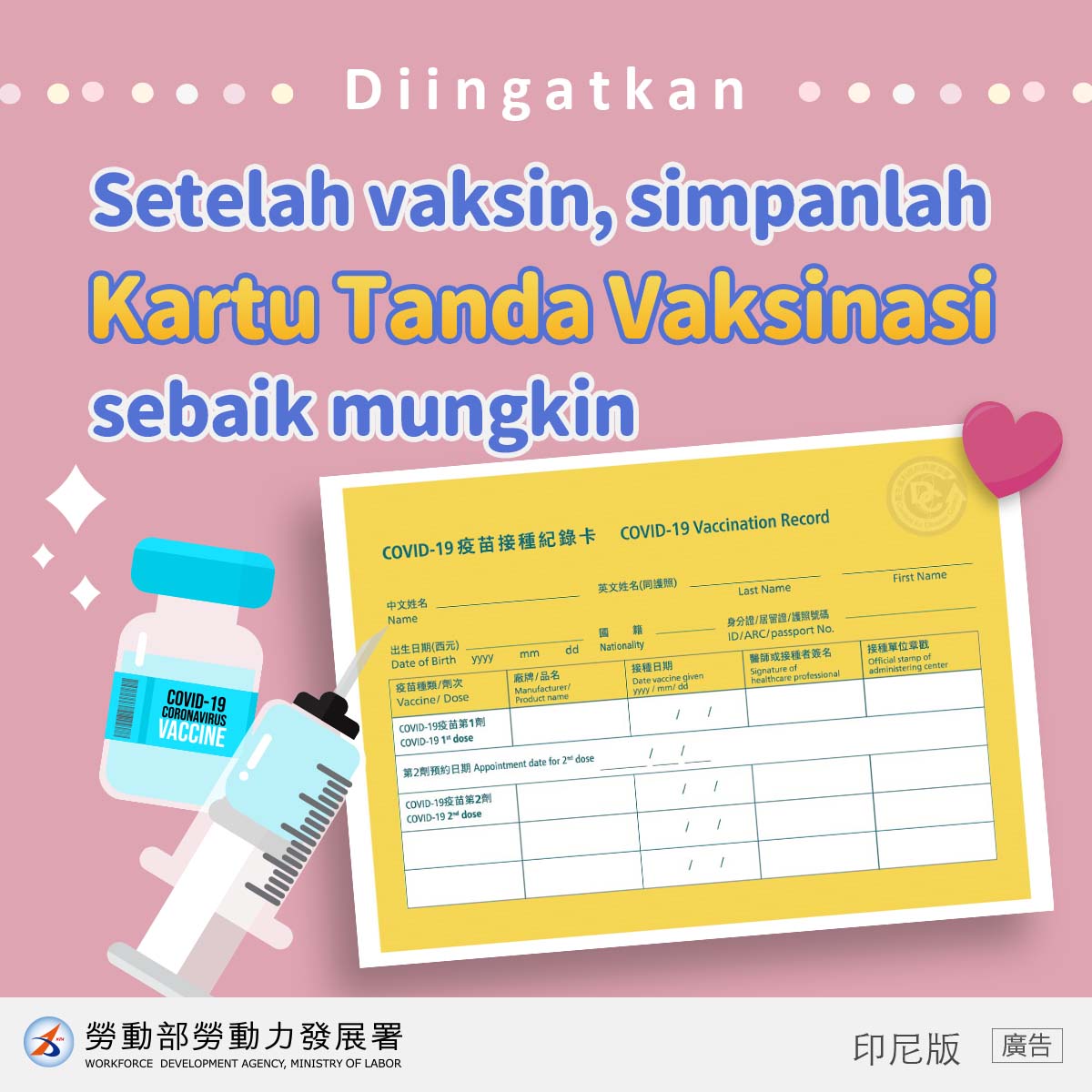 1. Setelah vaksinasi, selain harus tetap mengenakan masker dan rajin cuci tangan, Anda juga harus menyimpan kartu tanda vaksinasi COVID-19 sebaik mungkin!