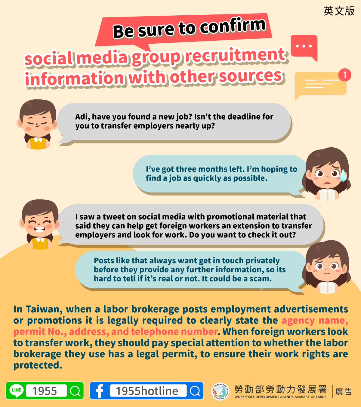 ตามกฎหมายของไต้หวัน การโฆษณาหรือประชาสัมพันธ์ของบริษัทจัดหางาน ต้องมีการระบุ ชื่อบริษัท เลขที่ใบอนุญาตจัดหางาน ที่อยู่และเบอร์โทรศัพท์ อย่างชัดเจนแรงงานต่างชาติที่ต้องการเปลี่ยนนายจ้าง โปรดระมัดระวังว่าเป็นบริษัทจัดหางานถูกกฎหมายหรือไม่ เพื่อป้องกันมิให้ เกิดผลเสียต่อสิทธิประโยชน์ของตนเอง