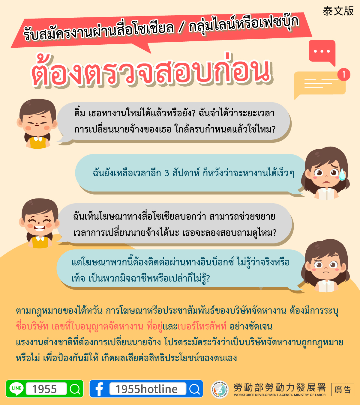 A:ฉันเห็นโฆษณาทางสื่อโซเชียลบอกว่า สามารถช่วยขยายเวลาการเปลี่ยนนายจ้างได้นะ เธอจะลองสอบถามดูไหม?