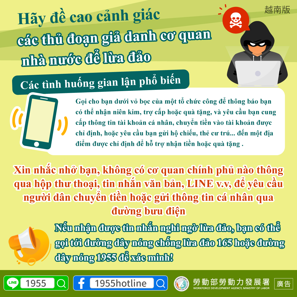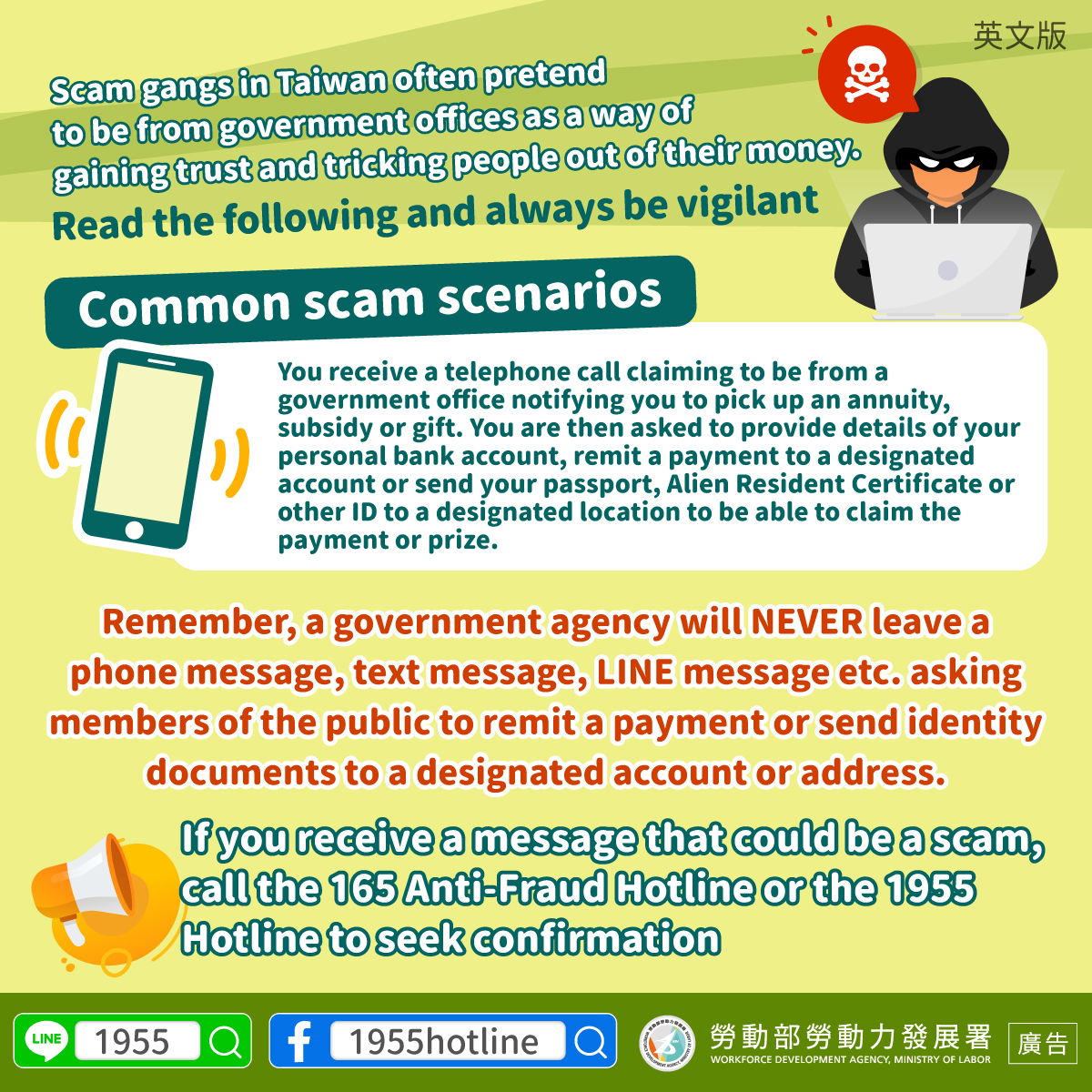 If you receive a message that could be a scam, call the 165 Anti-Fraud Hotline or the 1955 Hotline to seek confirmation