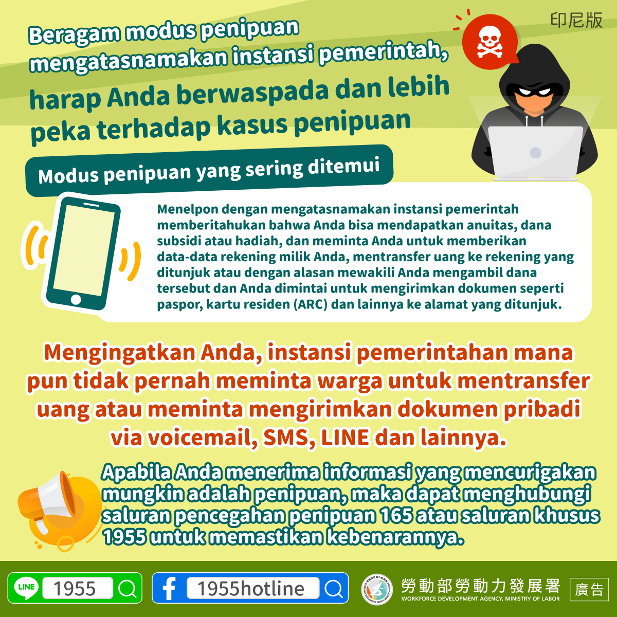 Apabila Anda menerima informasi yang mencurigakan mungkin adalah penipuan, maka dapat menghubungi saluran pencegahan penipuan 165 atau saluran khusus 1955 untuk memastikan kebenarannya.