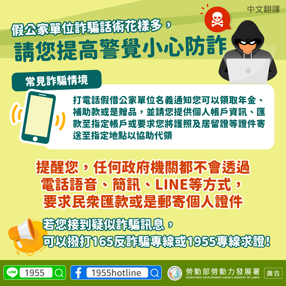 LINE@移點通-假公家單位詐騙話術花樣多,請您提高警覺小心防詐【詐騙宣導-假公家單位】-多國語言版
