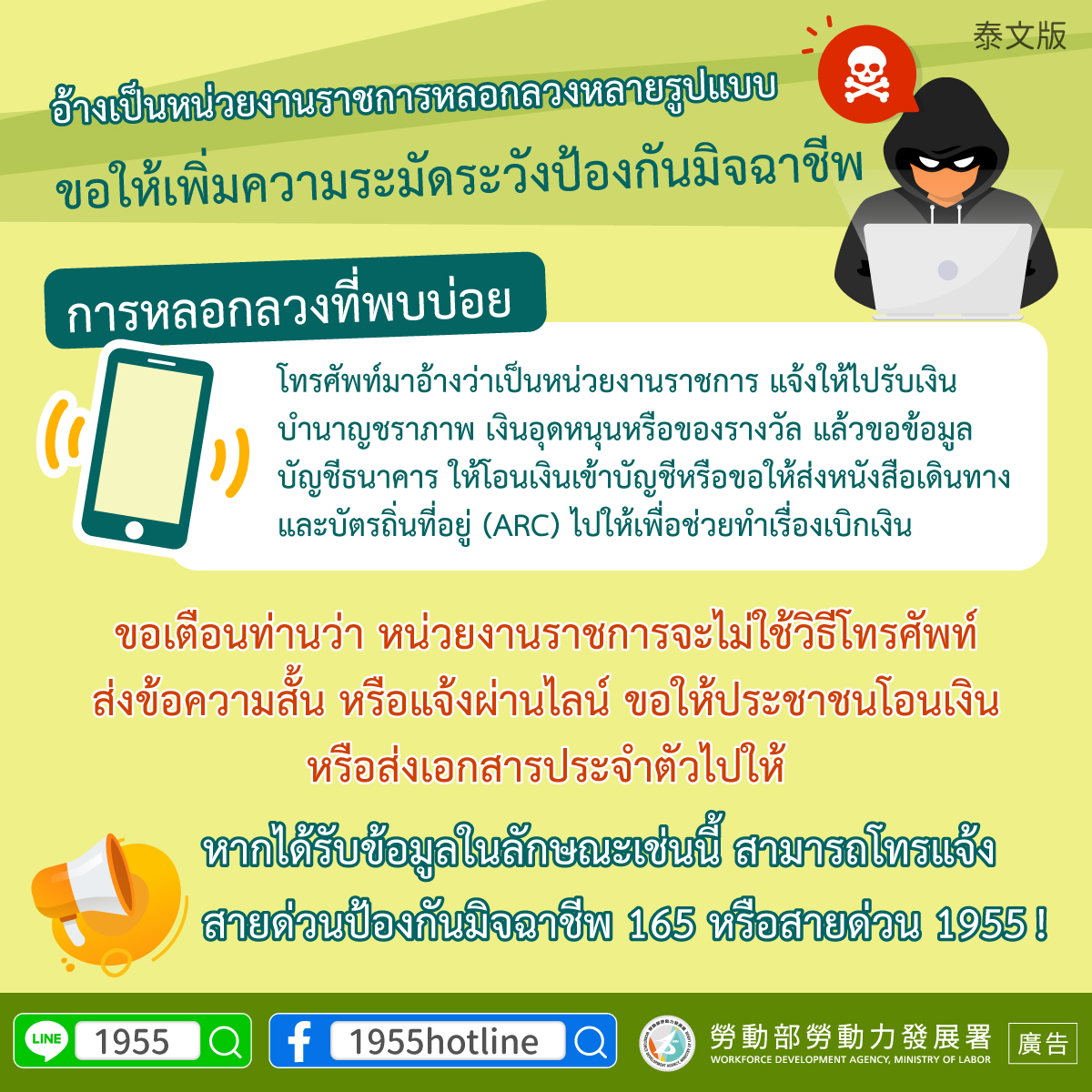 หากได้รับข้อมูลในลักษณะเช่นนี้ สามารถโทรแจ้งสายด่วนป้องกันมิจฉาชีพ 165 หรือสายด่วน 1955 !