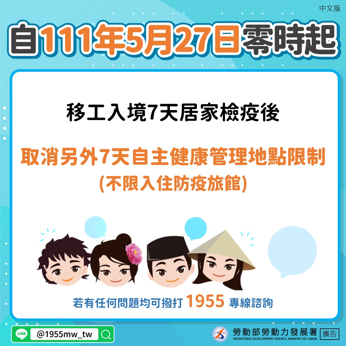 因應國內疫情情勢及總體防疫整備,為配合指揮中心提升整體隔離量能,並逐步鬆綁隔離規範,勞動部經指揮中心同意,自111年5月27日零時起,取消移工入境7天居家檢疫後,應於同一地點完成自主健康管理之限制。移工自主健康管理期間,應遵守防疫規範,外出應配戴口罩,可外出工作,但禁止與他人聚餐、聚會或參加公眾集會。