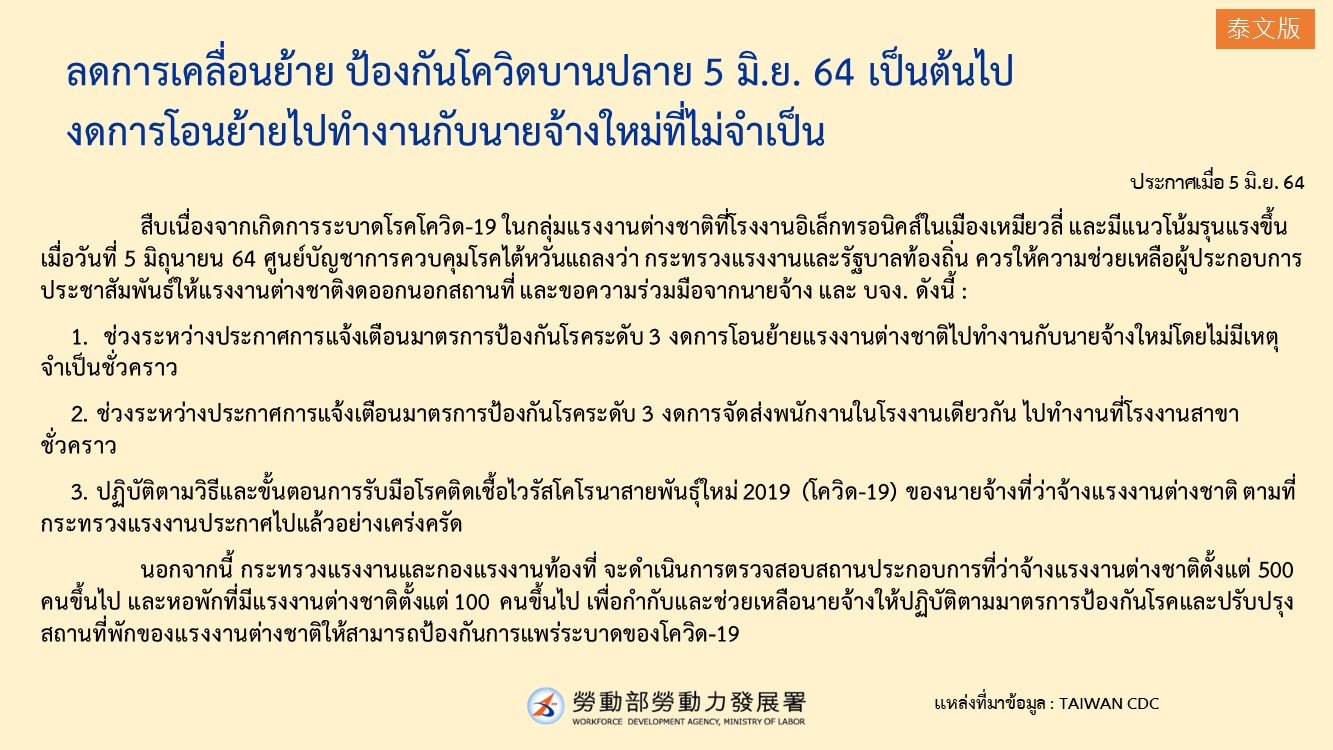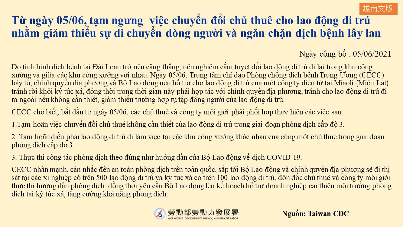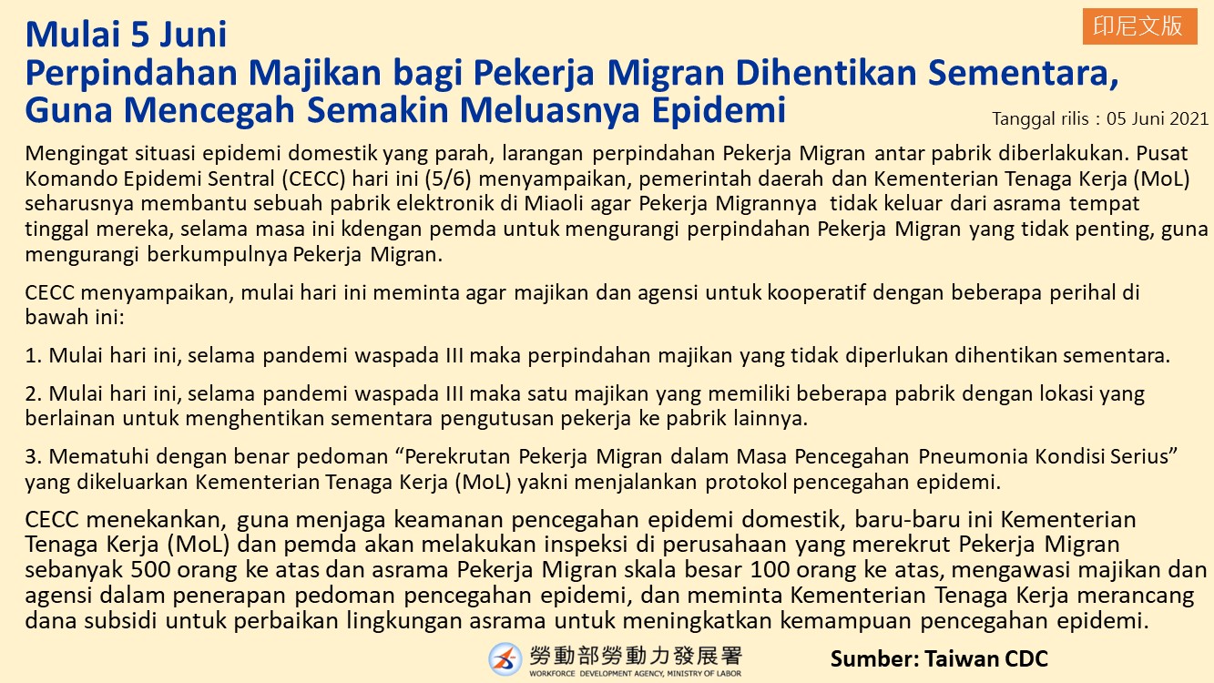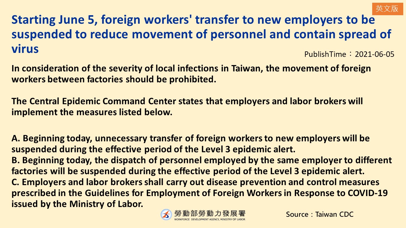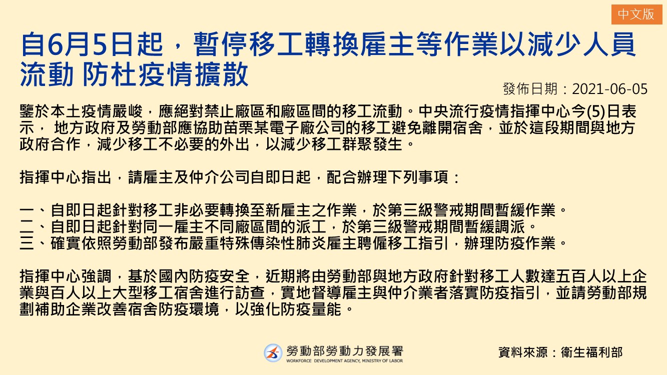 自6月5日起,暫停移工轉換雇主等作業以減少人員流動 防杜疫情擴散-多國語版