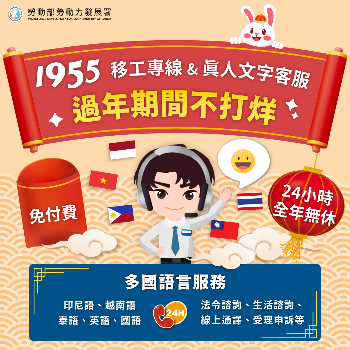 勞動部1955專線農曆春節期間服務不打烊!