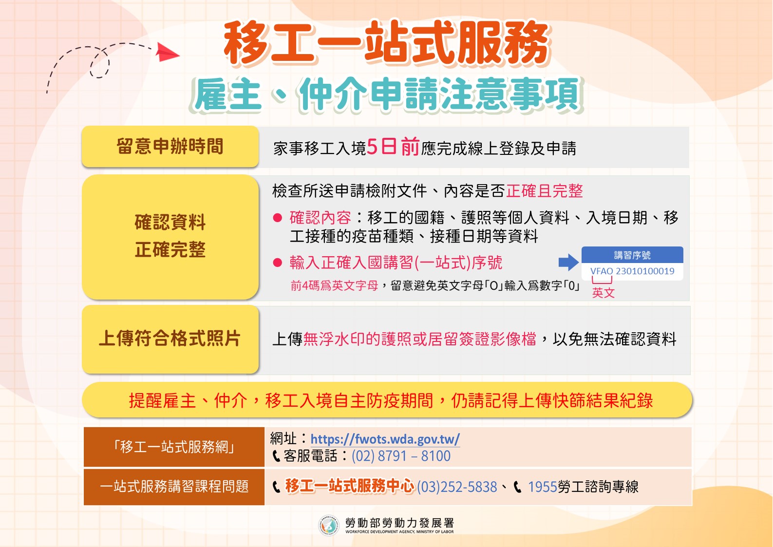 在申請移工一站式服務時,仍有少數的雇主、仲介在申請流程時容易疏忽的地方,勞動力發展署提醒雇主、仲介提出申請前,請先檢視並準備好申辦資料,掌握3項重點注意事項,申請的流程就會順暢不卡關。首先是「完整上傳」,確認申請所需要檢附的文件及內容是否完整並確認有上傳,例如:移工的國籍、護照等個人資料、預定入境的日期、移工接種的疫苗種類、接種疫苗日期等。第2項重點是「資料正確」,送出申請前,先檢查填寫的資料是否完整、英數字有無短少,例如入國講習(一站式)序號前4碼為英文字母,剩下的為數字,常見將英文代碼「o」,卻錯誤輸入為數字「0」,導致序號輸入錯誤的情形。第3項重點「照片清晰」,移工申請居留證的照片應清晰,請附上無浮水印的護照或居留簽證影像檔,以免無法確認資料。另外也提醒雇主、仲介,移工入境自主防疫期間,仍請記得至移工機場服務網上傳快篩結果紀錄。